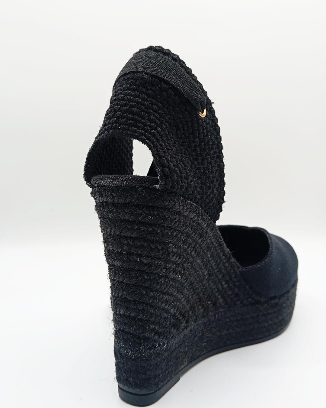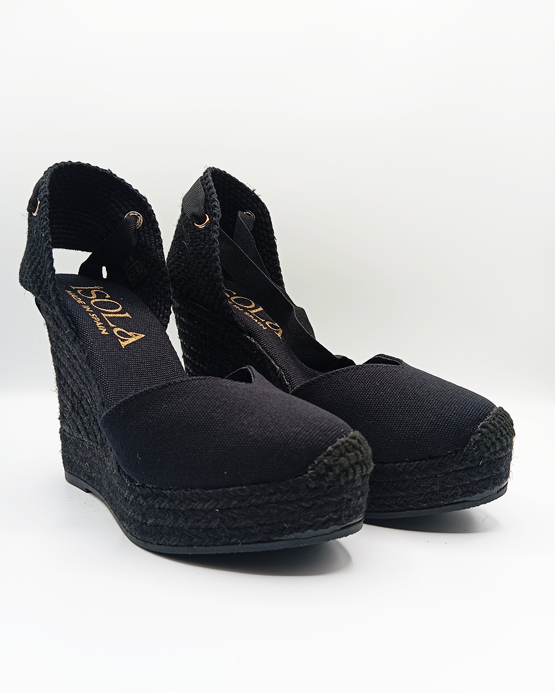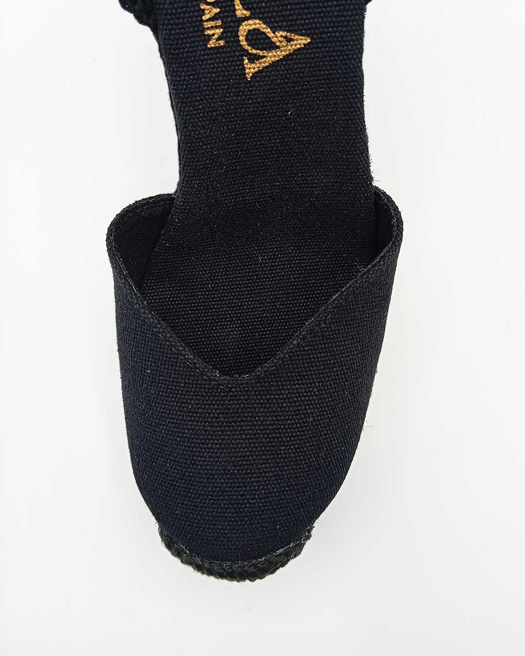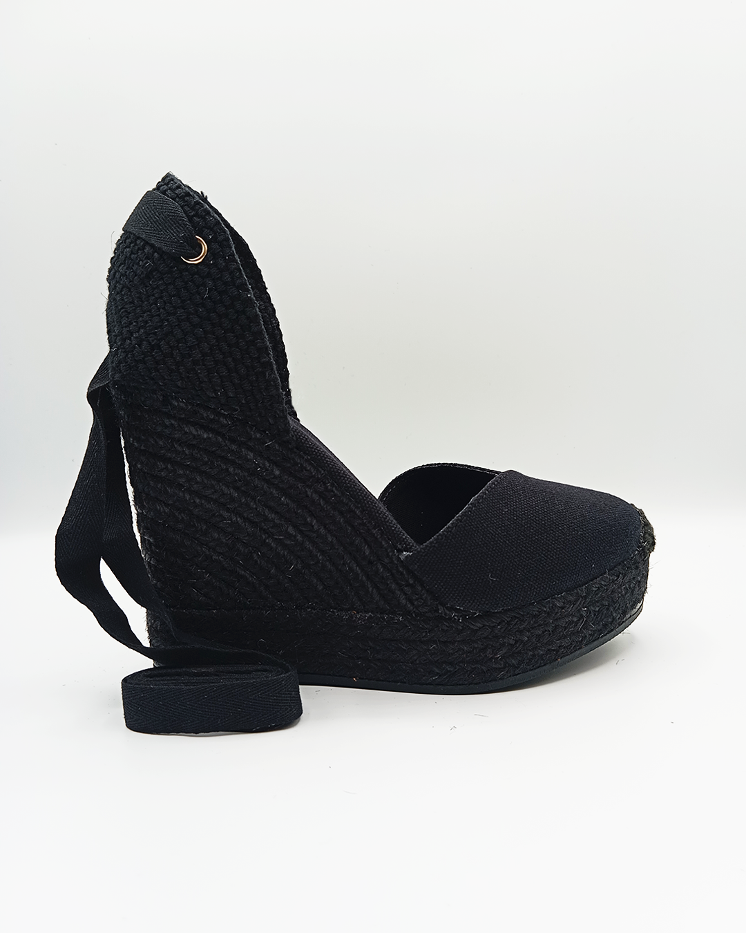 Alpargata de mujer confeccionada en algodón con diseño cerrado, escote en pico y talonera ajustable con cintas que se anudan al tobillo. Incorpora una cómoda plantilla acolchada y una cuña de yute natural de 11,5 cm con plataforma de 3,5 cm. Elaborada artesanalmente en España, es un modelo clásico y versátil que nunca pasa de moda — perfecto para elevar cualquier look con un toque europeo.