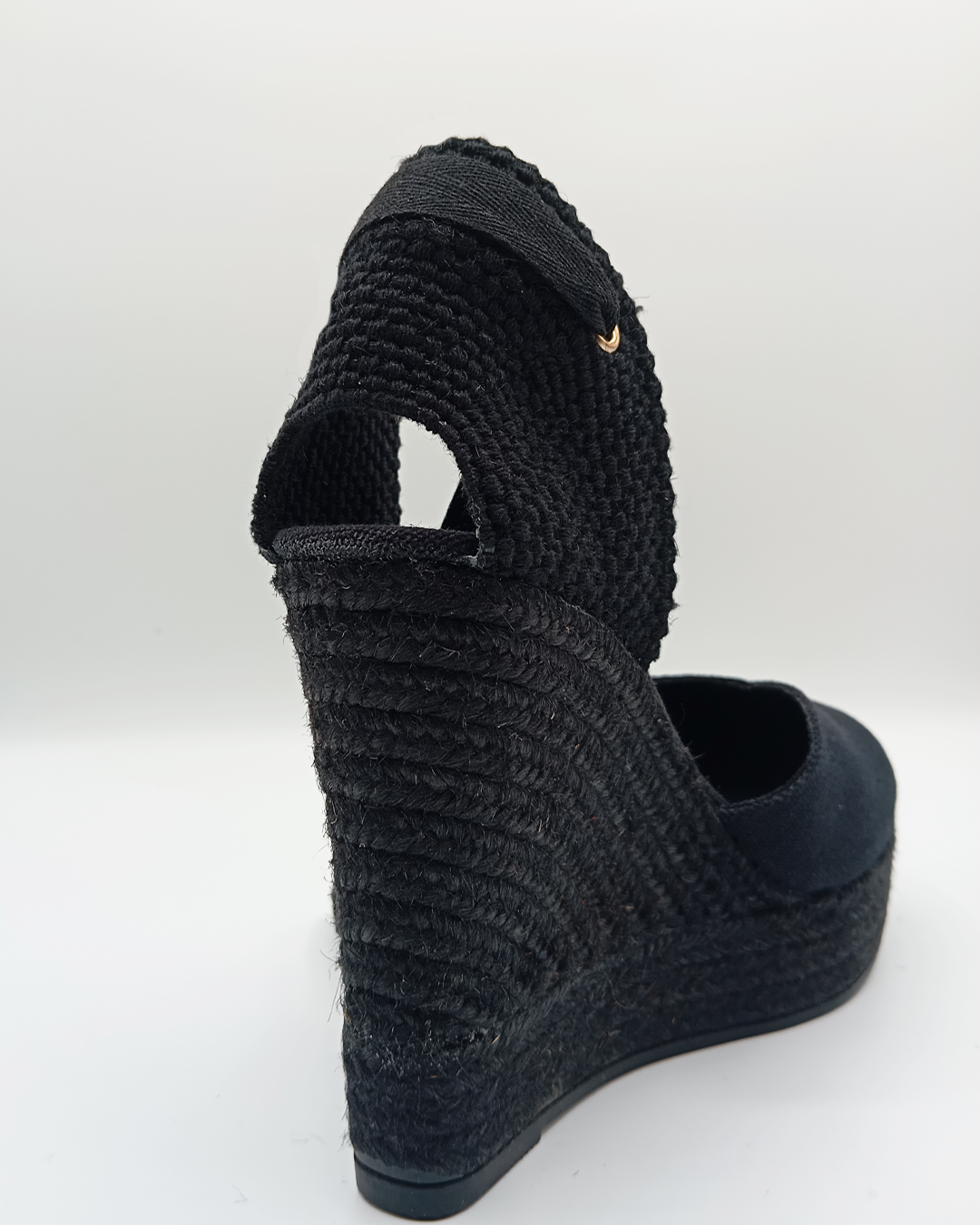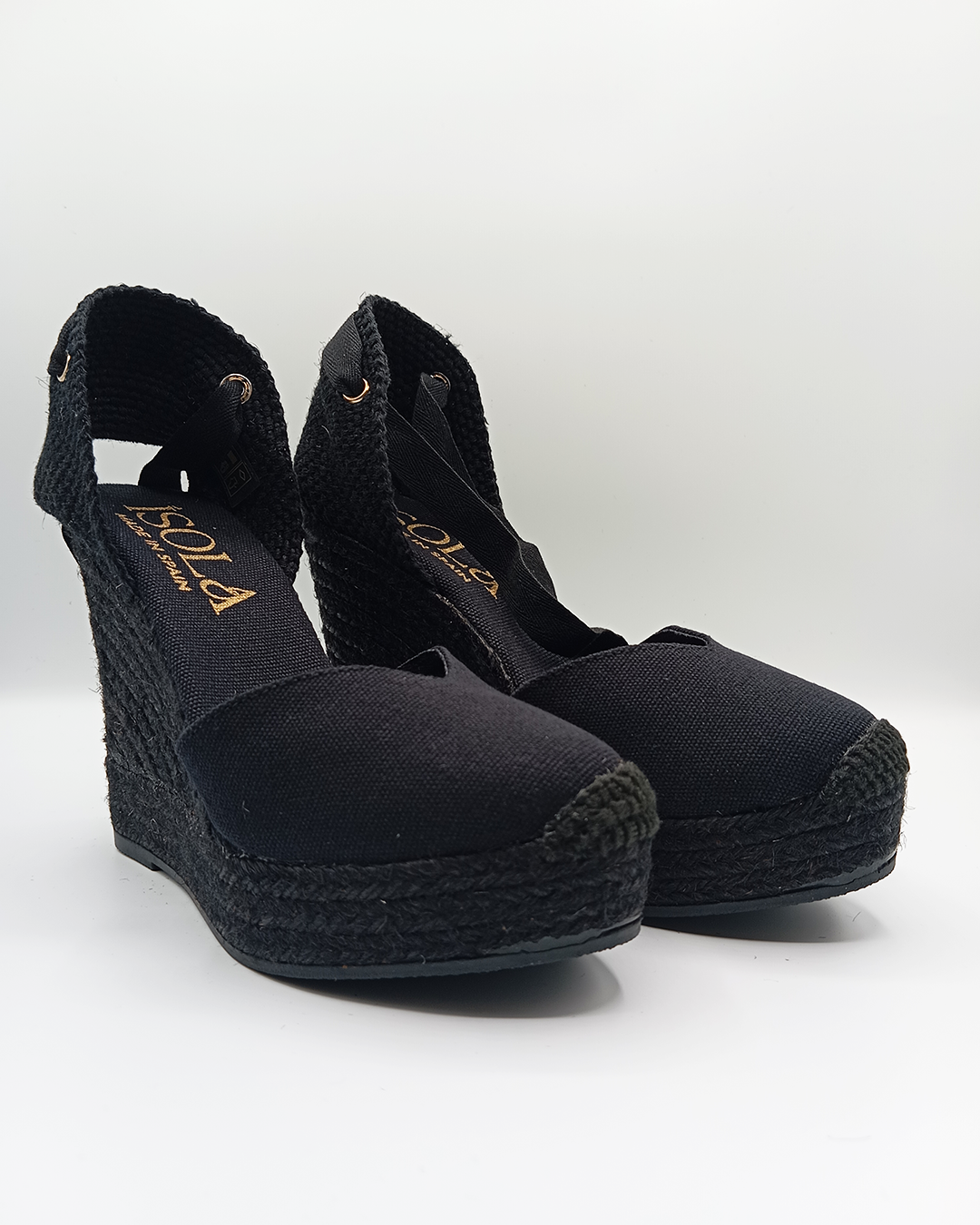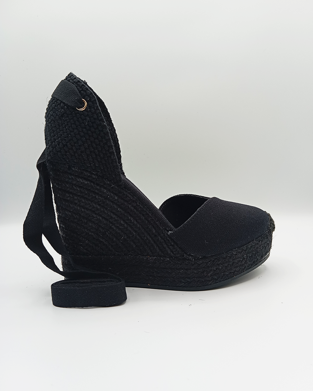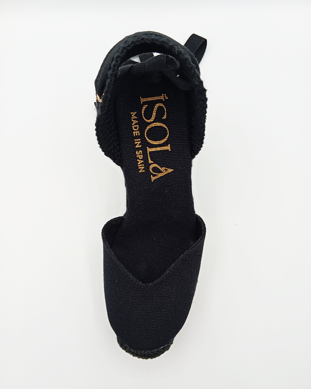 Alpargata de mujer confeccionada en algodón con diseño cerrado, escote en pico y talonera ajustable con cintas que se anudan al tobillo. Incorpora una cómoda plantilla acolchada y una cuña de yute natural de 11,5 cm con plataforma de 3,5 cm. Elaborada artesanalmente en España, es un modelo clásico y versátil que nunca pasa de moda — perfecto para elevar cualquier look con un toque europeo.