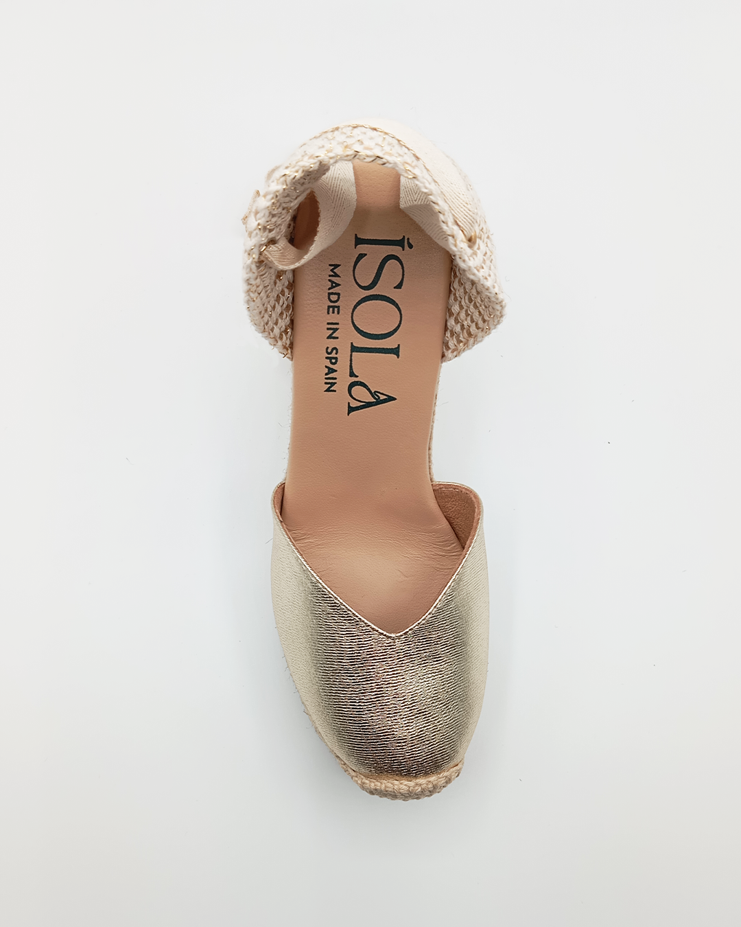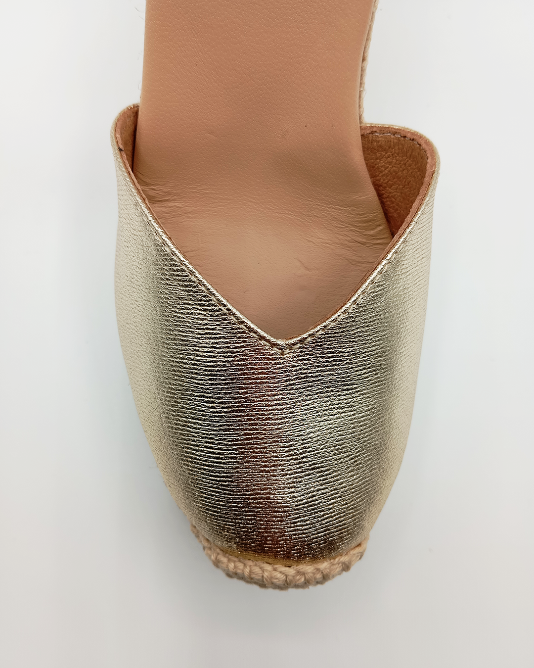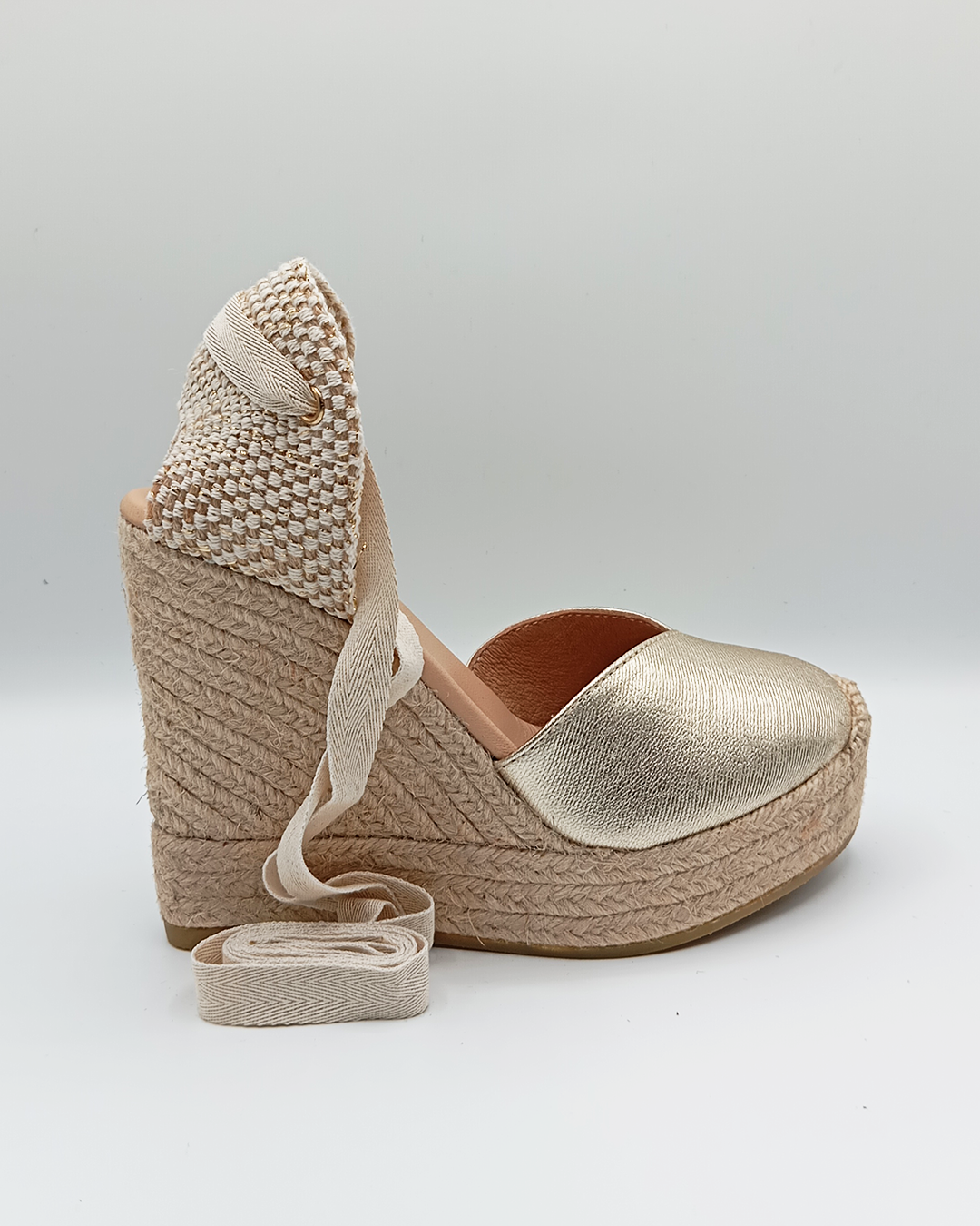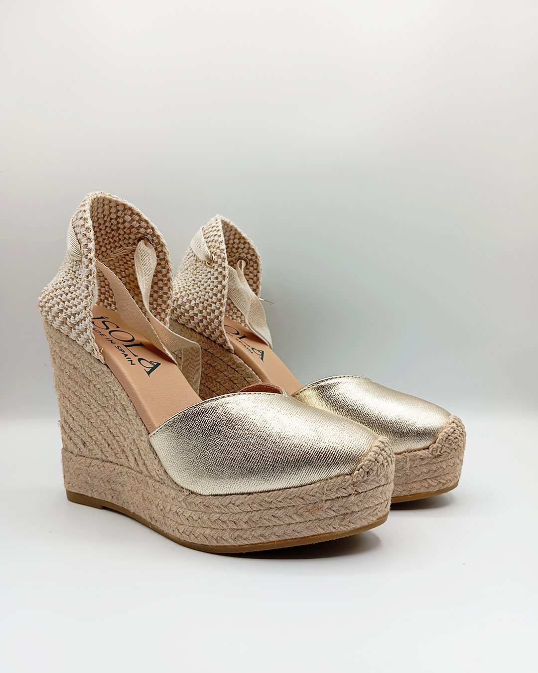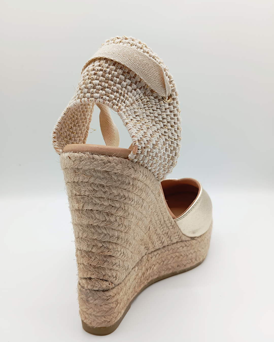 Alpargata de mujer confeccionada en algodón con diseño cerrado, escote en pico y talonera ajustable con cintas que se anudan al tobillo. Incorpora una cómoda plantilla acolchada y una cuña de yute natural de 11,5 cm con plataforma de 3,5 cm. Elaborada artesanalmente en España, es un modelo clásico y versátil que nunca pasa de moda — perfecto para elevar cualquier look con un toque europeo.