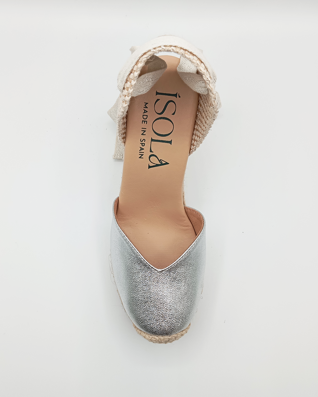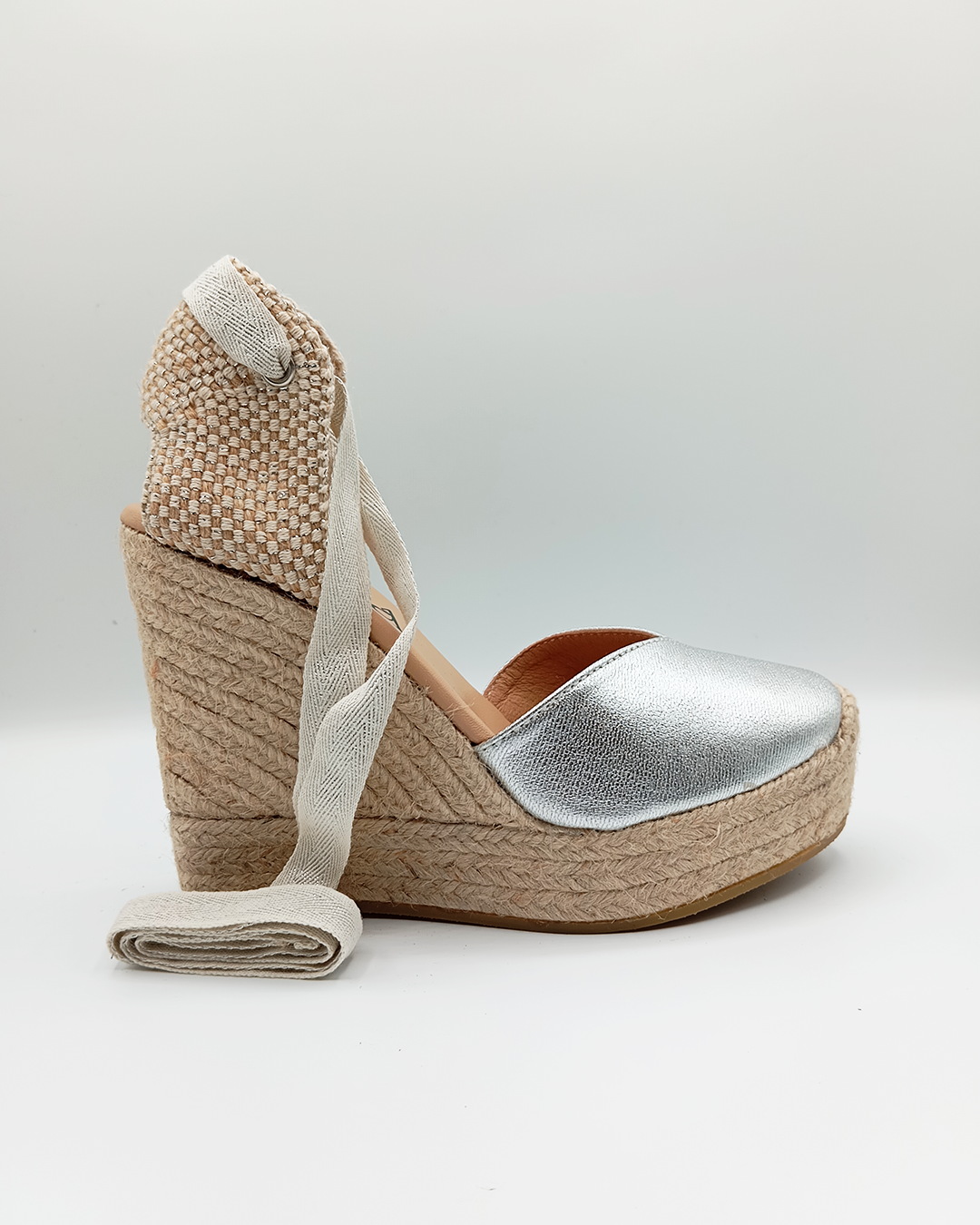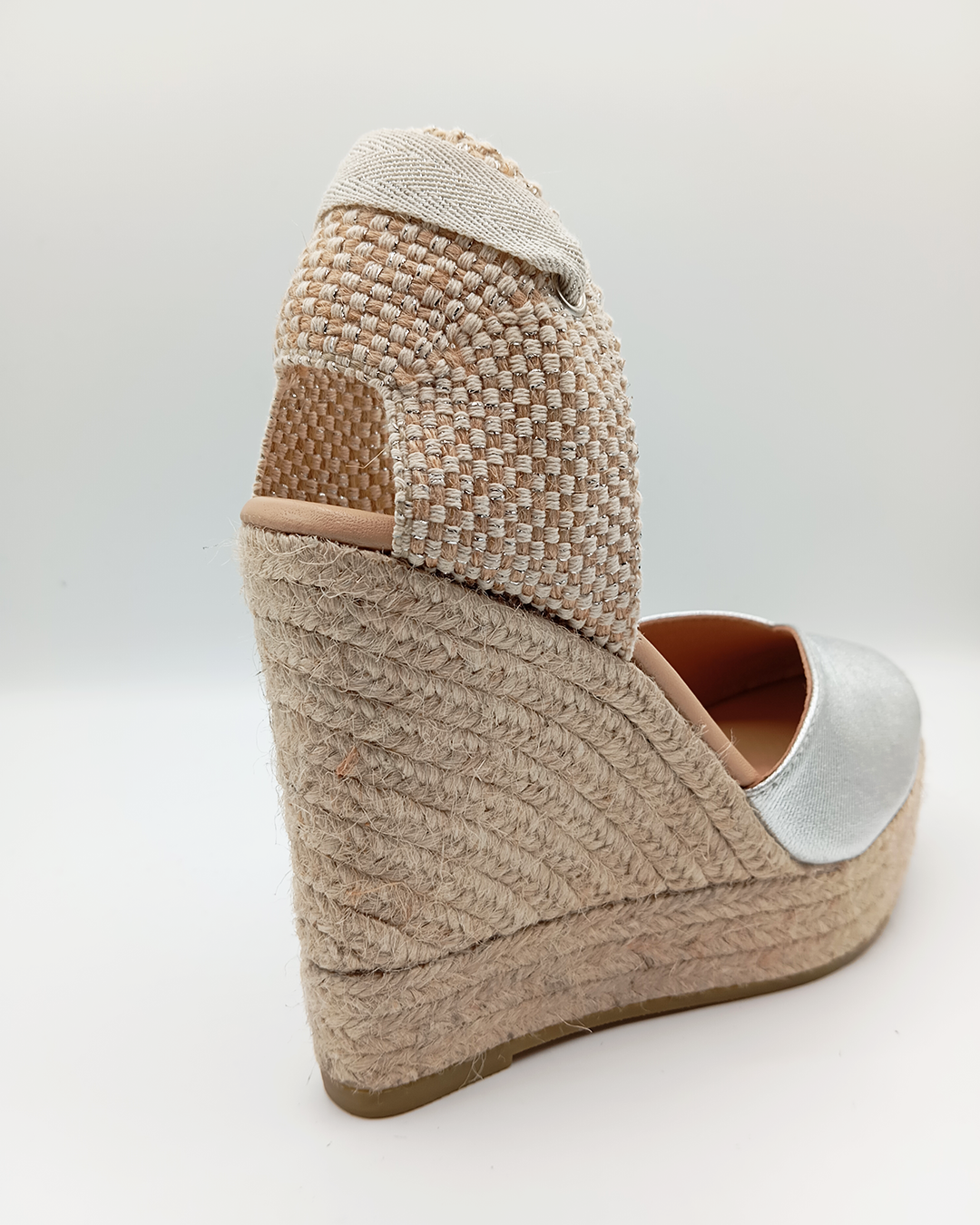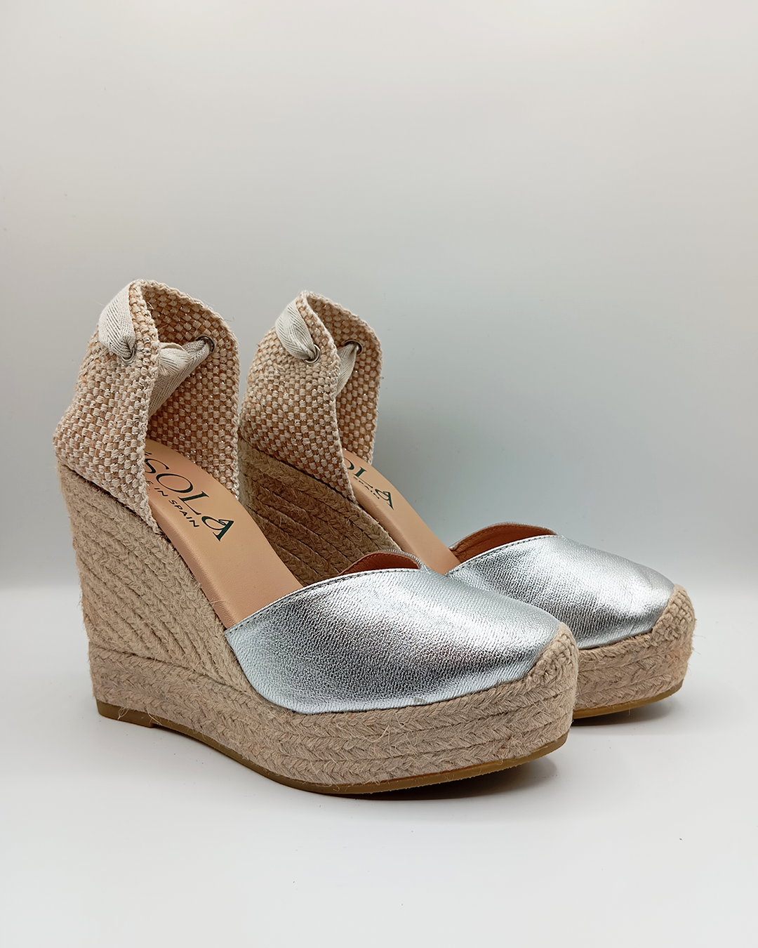 Alpargata de mujer confeccionada en algodón con diseño cerrado, escote en pico y talonera ajustable con cintas que se anudan al tobillo. Incorpora una cómoda plantilla acolchada y una cuña de yute natural de 11,5 cm con plataforma de 3,5 cm. Elaborada artesanalmente en España, es un modelo clásico y versátil que nunca pasa de moda — perfecto para elevar cualquier look con un toque europeo.
