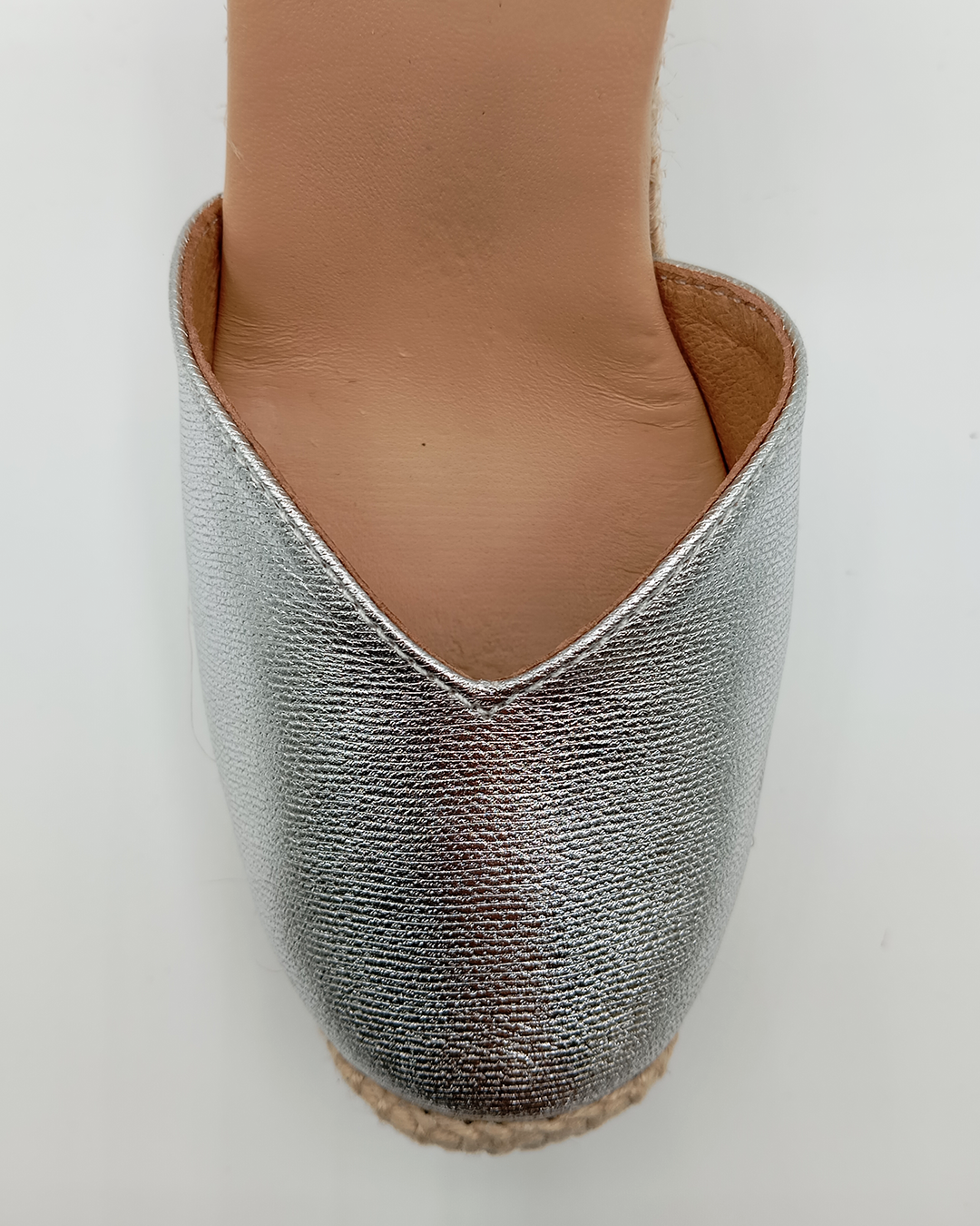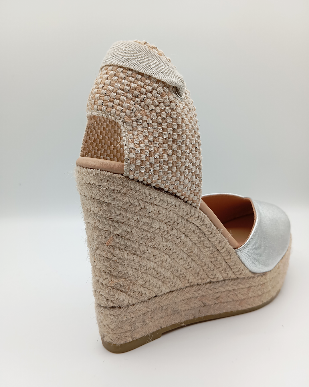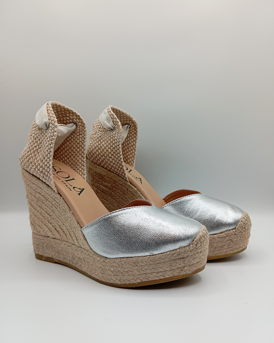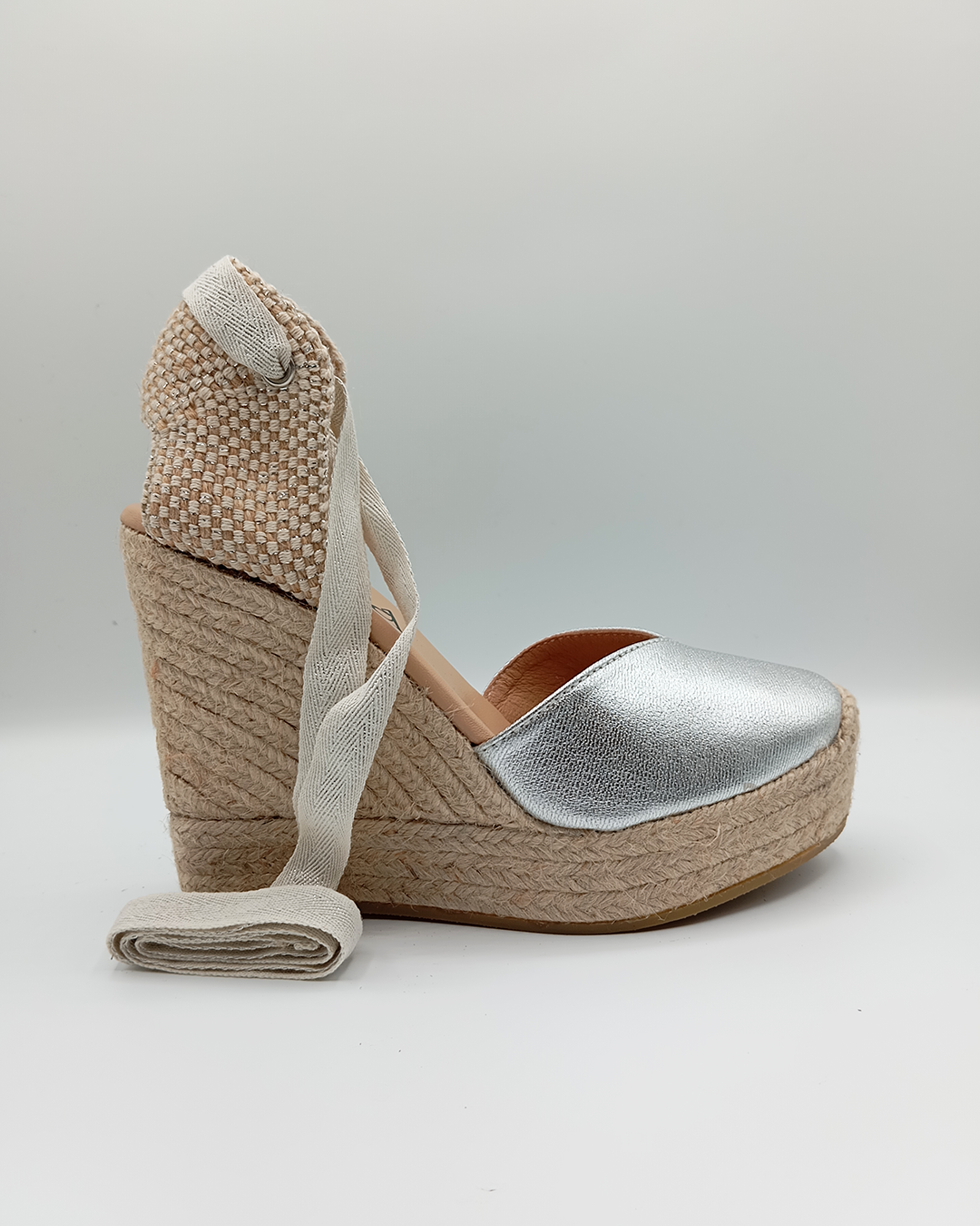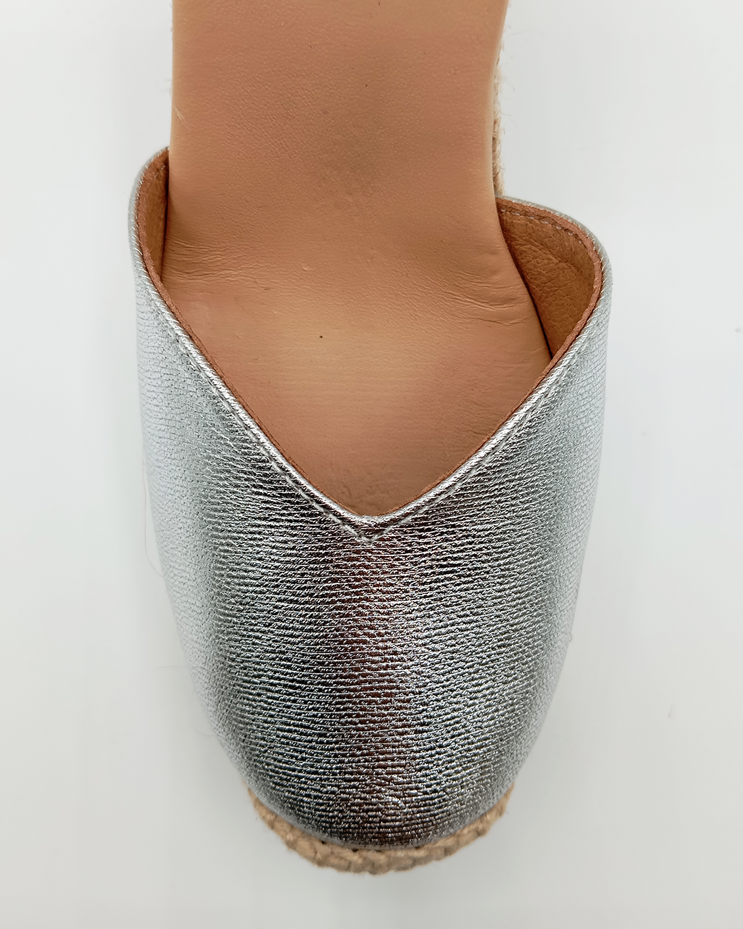 Alpargata de mujer confeccionada en algodón con diseño cerrado, escote en pico y talonera ajustable con cintas que se anudan al tobillo. Incorpora una cómoda plantilla acolchada y una cuña de yute natural de 11,5 cm con plataforma de 3,5 cm. Elaborada artesanalmente en España, es un modelo clásico y versátil que nunca pasa de moda — perfecto para elevar cualquier look con un toque europeo.
