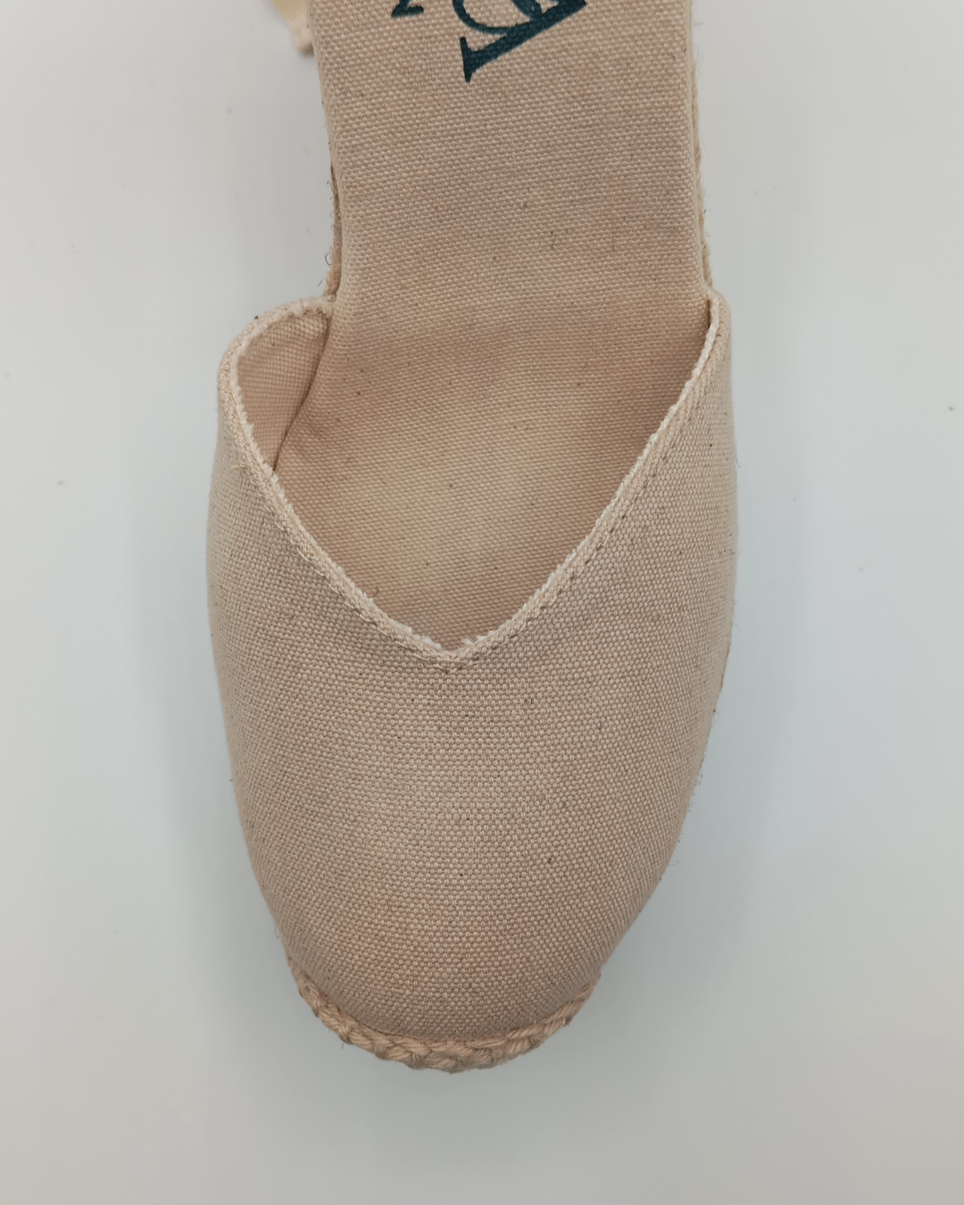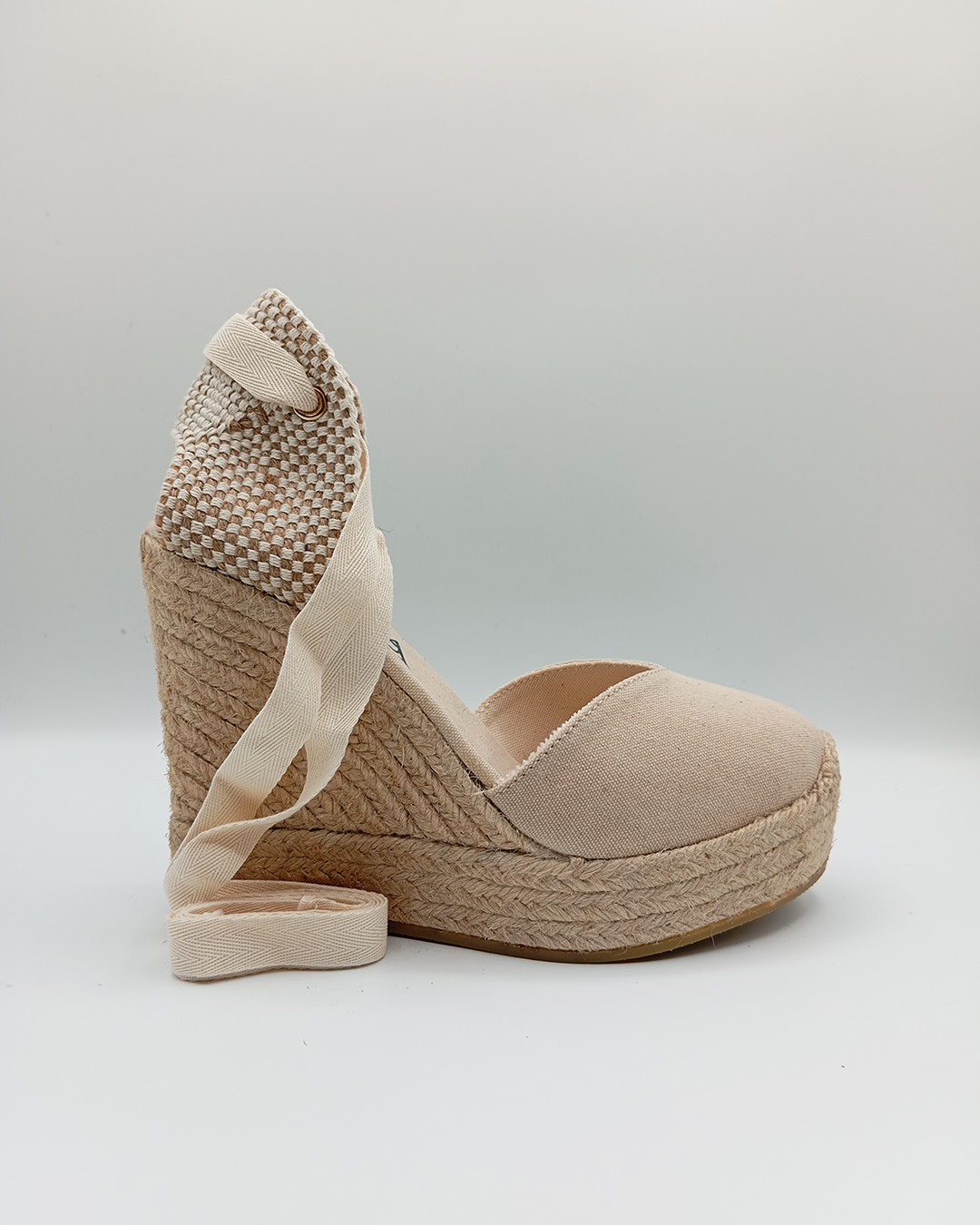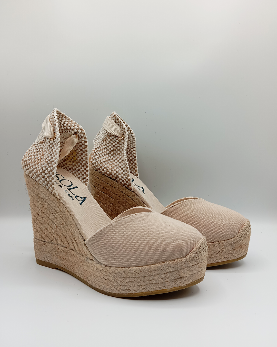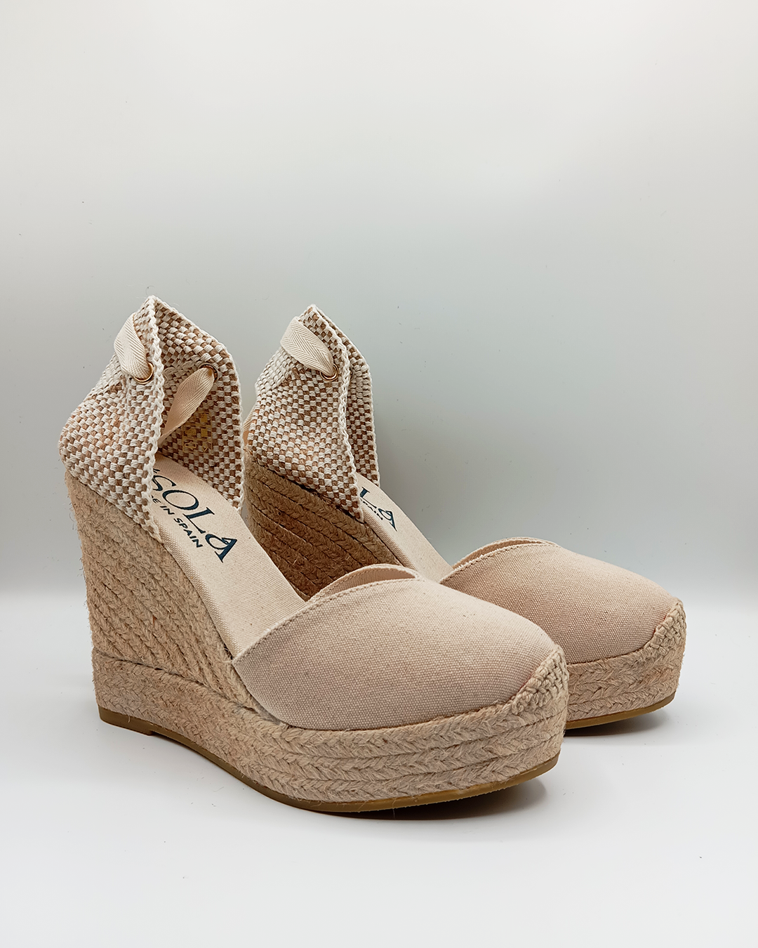 Alpargata de mujer confeccionada en algodón con diseño cerrado, escote en pico y talonera ajustable con cintas que se anudan al tobillo. Incorpora una cómoda plantilla acolchada y una cuña de yute natural de 11,5 cm con plataforma de 3,5 cm. Elaborada artesanalmente en España, es un modelo clásico y versátil que nunca pasa de moda — perfecto para elevar cualquier look con un toque europeo.