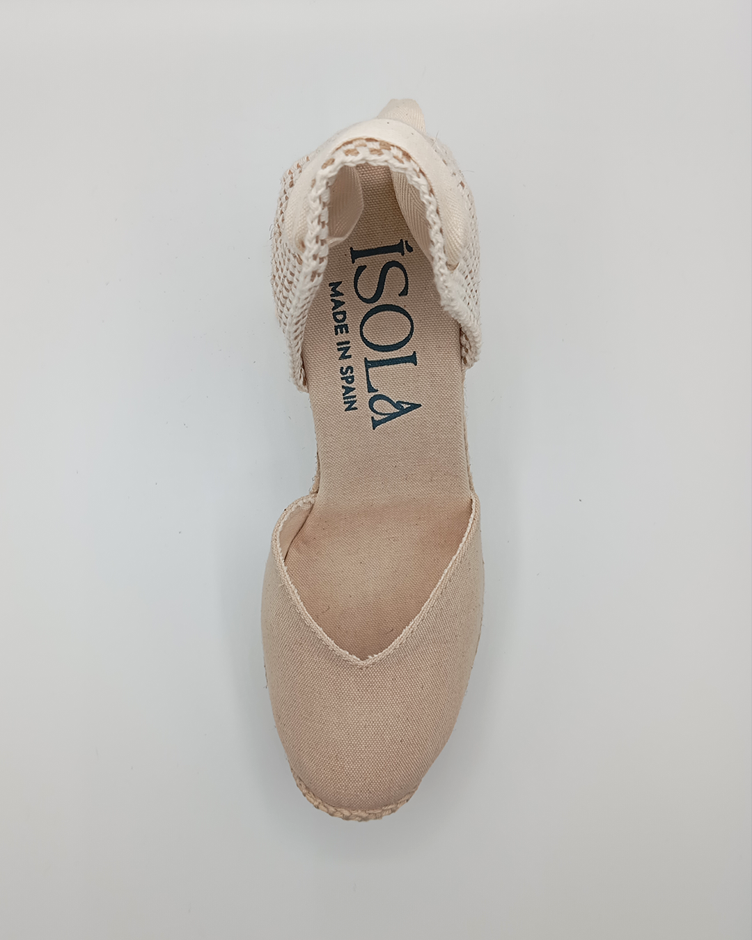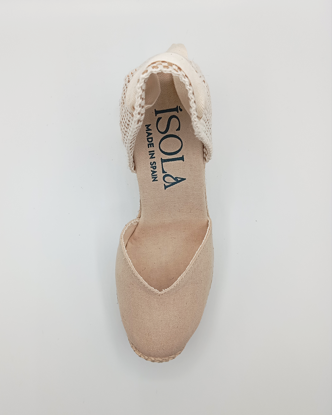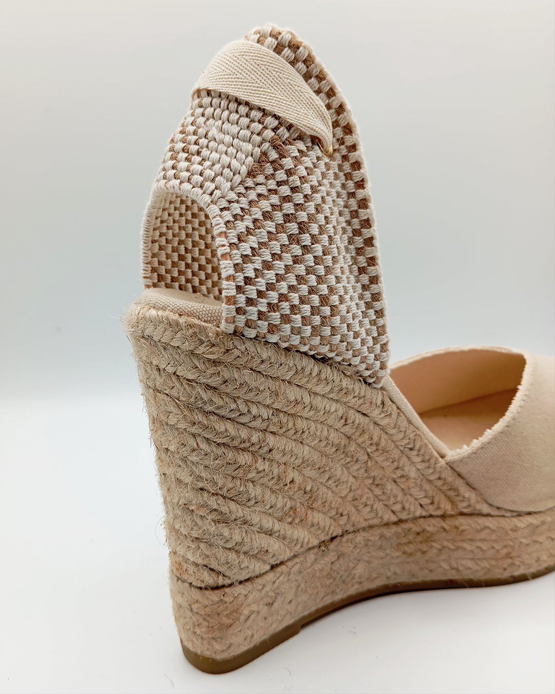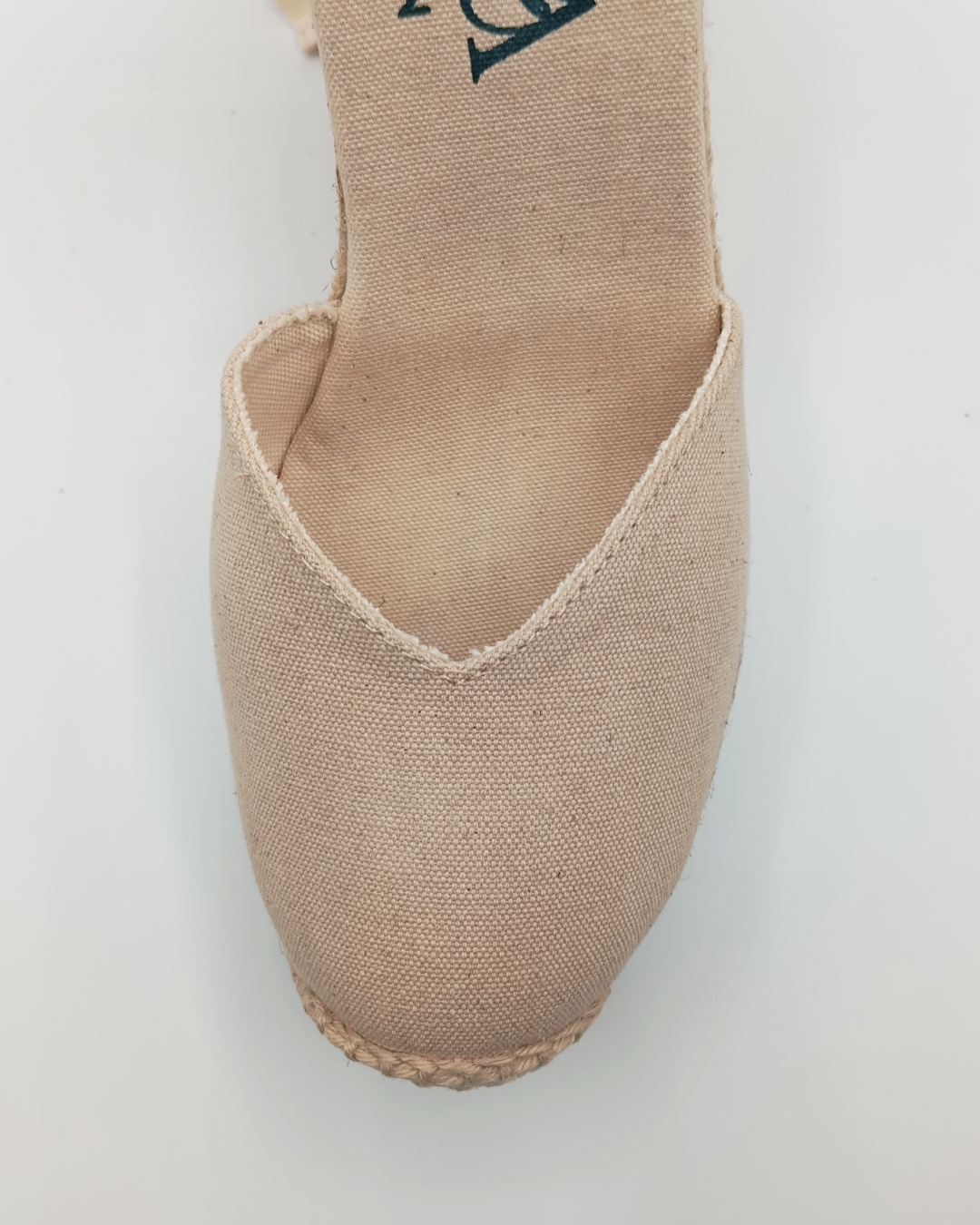 Alpargata de mujer confeccionada en algodón con diseño cerrado, escote en pico y talonera ajustable con cintas que se anudan al tobillo. Incorpora una cómoda plantilla acolchada y una cuña de yute natural de 11,5 cm con plataforma de 3,5 cm. Elaborada artesanalmente en España, es un modelo clásico y versátil que nunca pasa de moda — perfecto para elevar cualquier look con un toque europeo.
