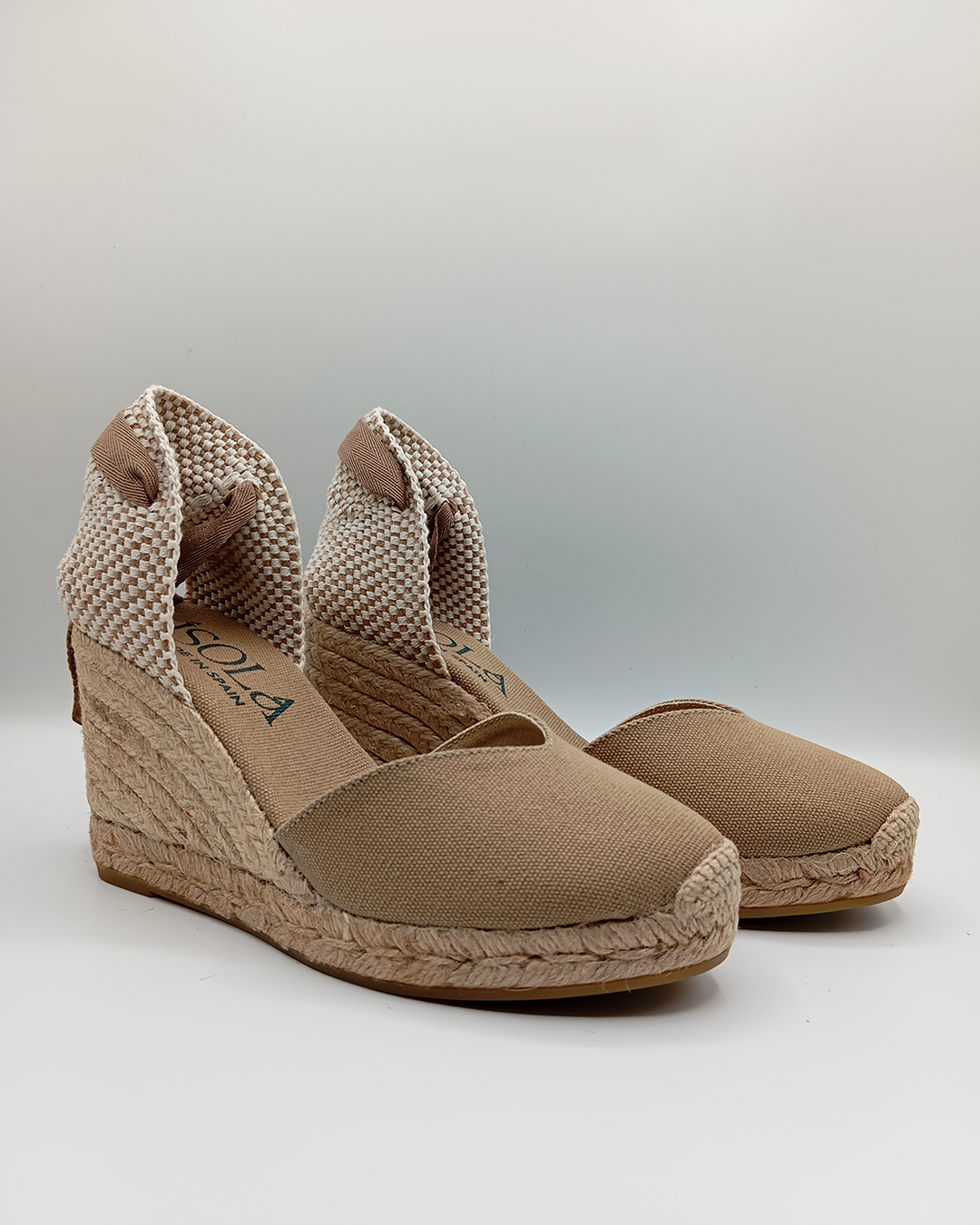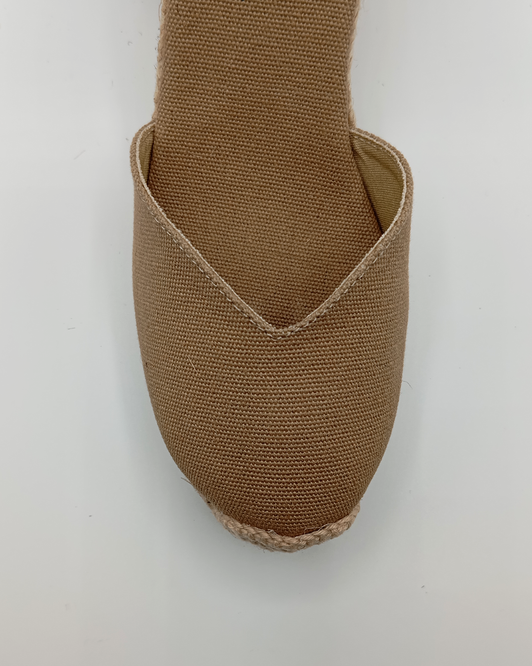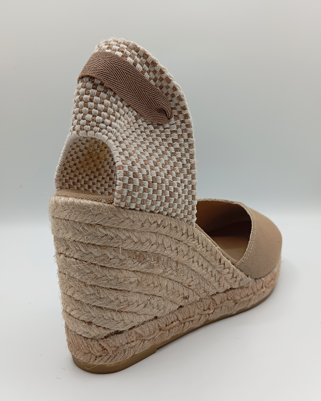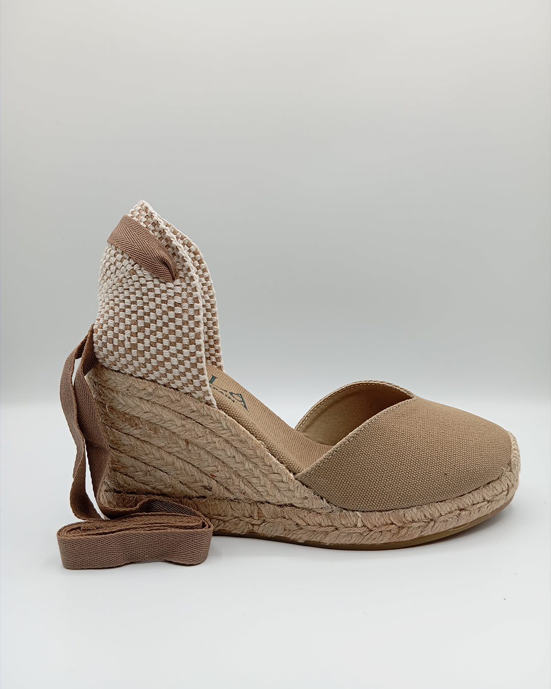 Alpargata de mujer confeccionada en algodón con diseño cerrado, escote en pico y talonera ajustable mediante cintas que se anudan al tobillo. Incluye plantilla acolchada para mayor confort y cuña de yute ecológico de 9 cm con plataforma de 1,6 cm. Elaborada artesanalmente en España, es un modelo icónico y atemporal, cómodo y versátil, perfecto para llevar en cualquier ocasión.