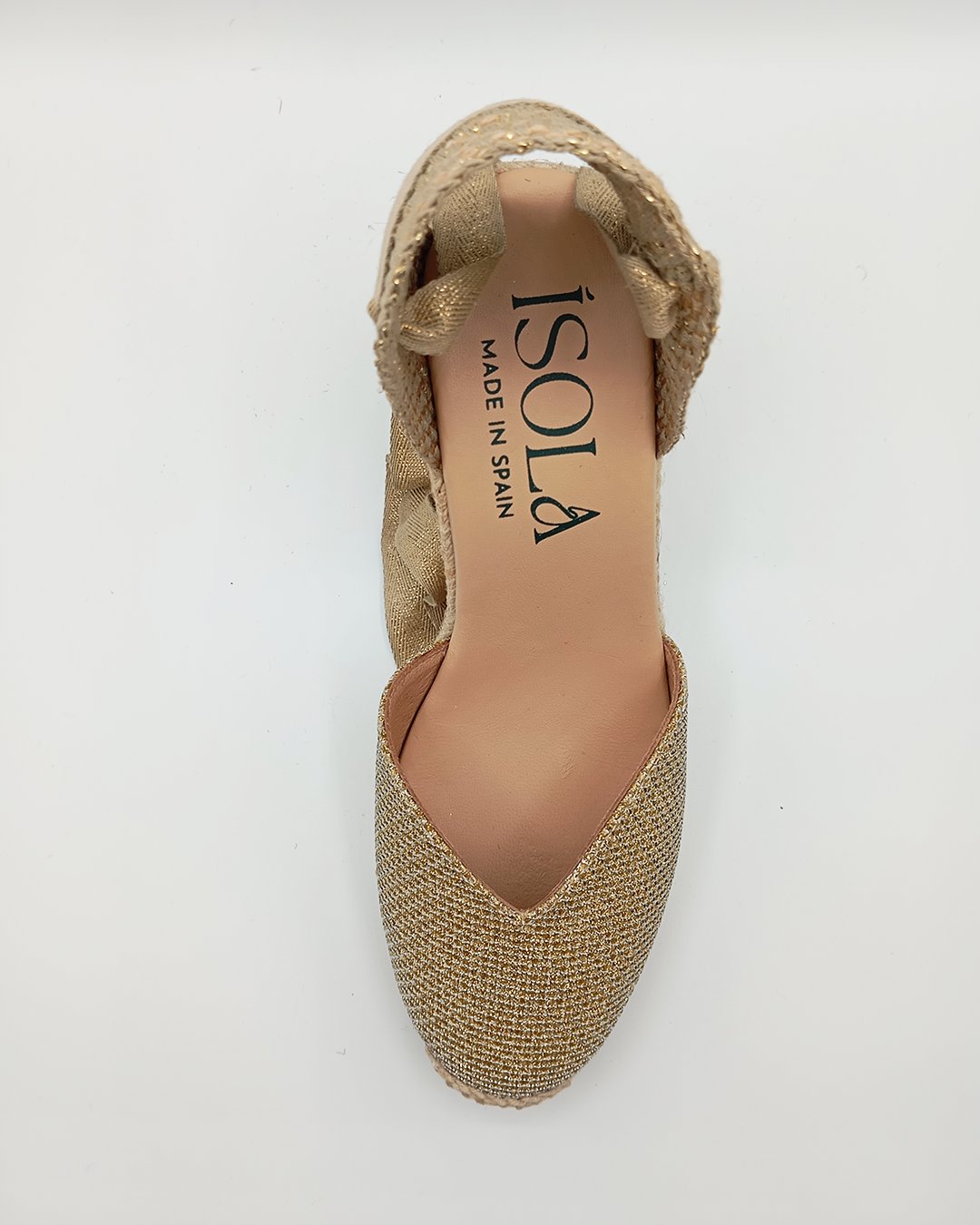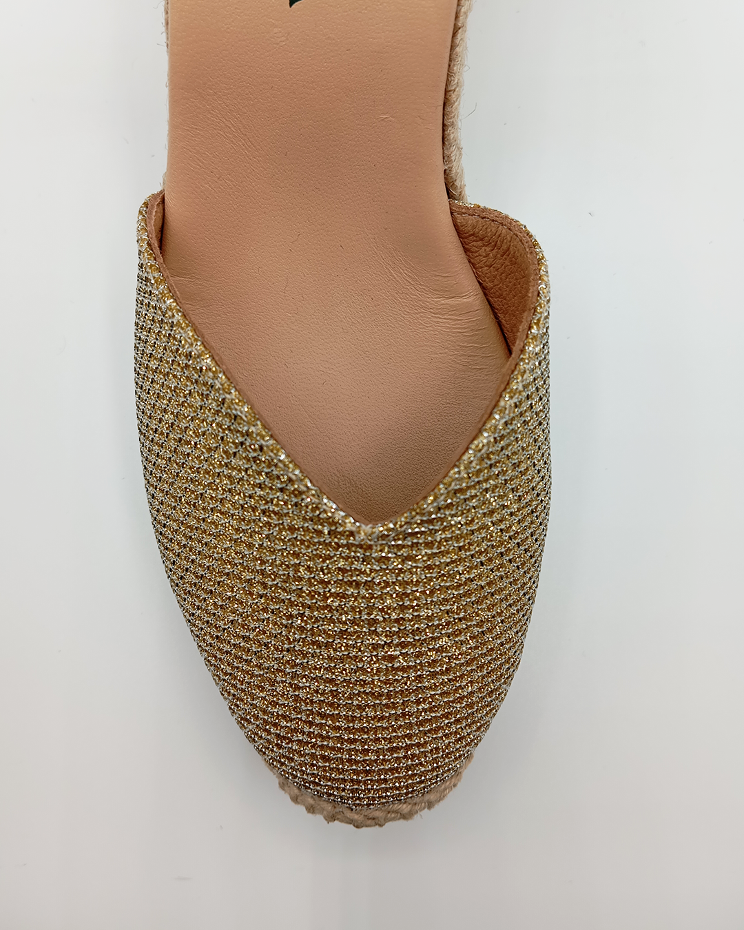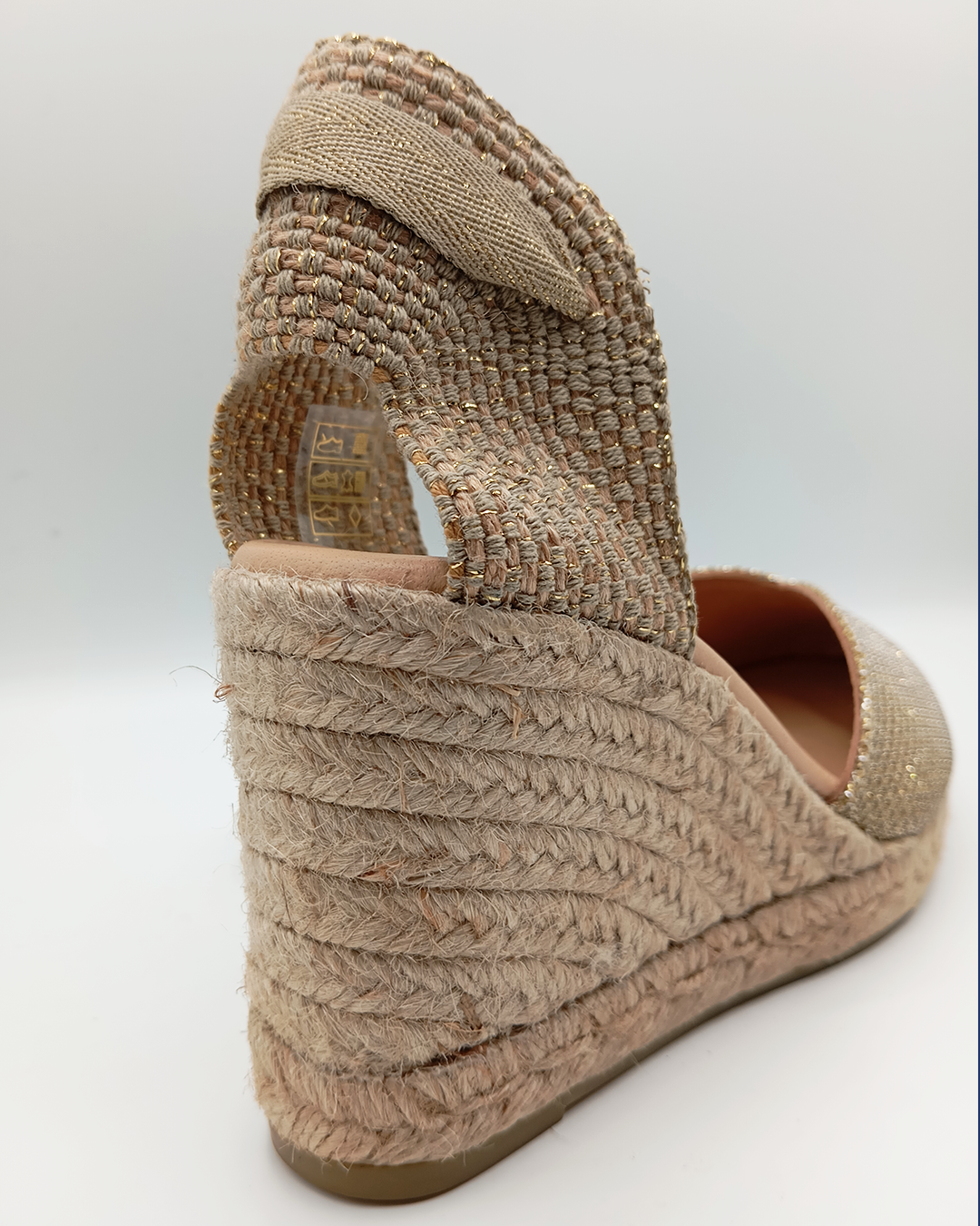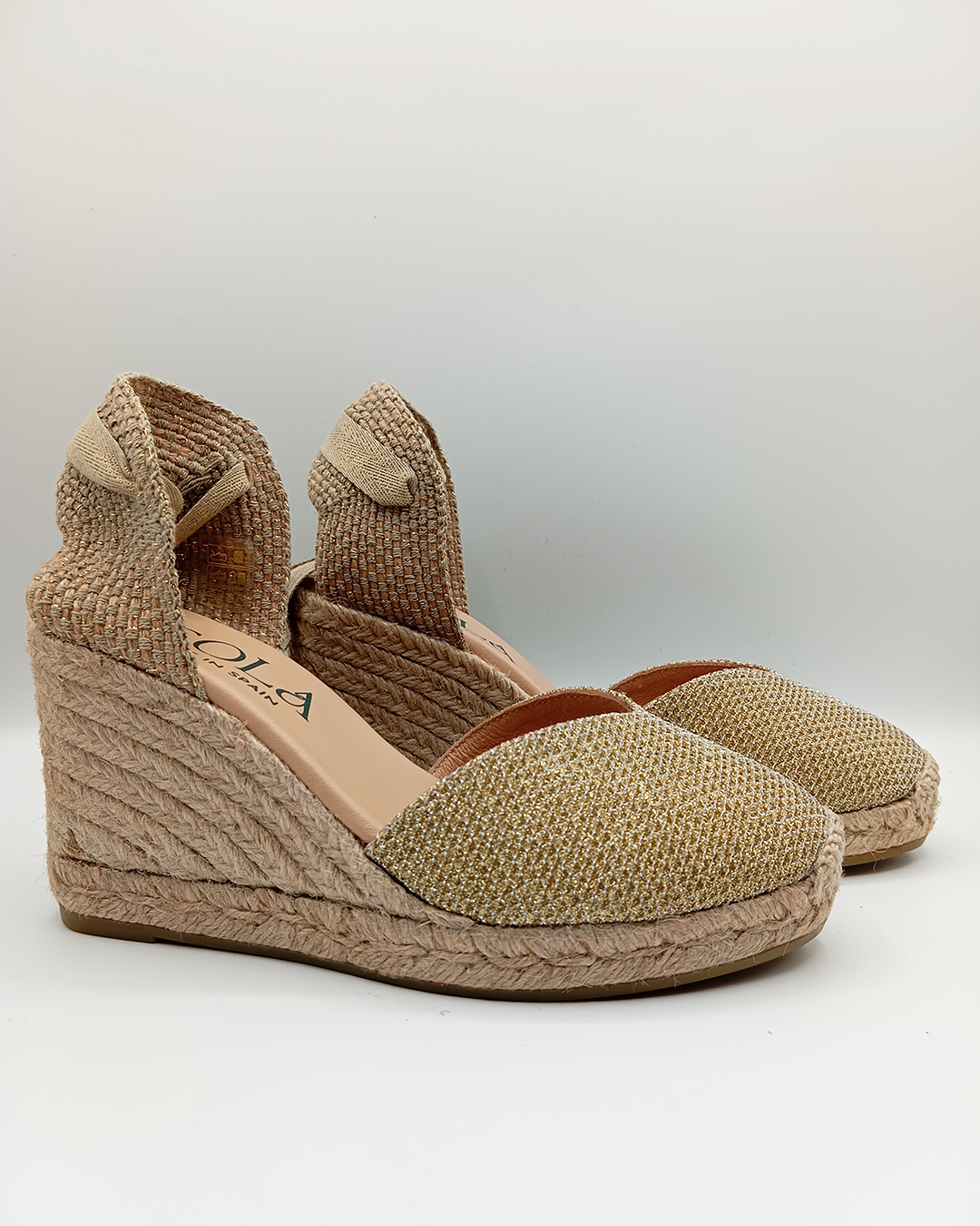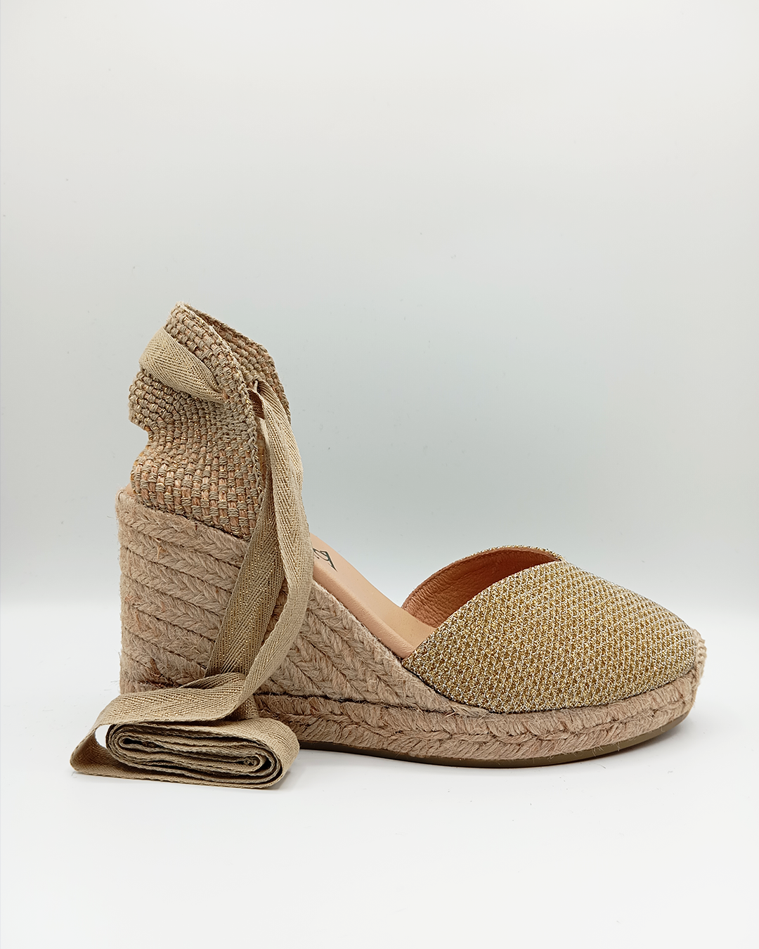 Alpargata de mujer confeccionada en algodón con diseño cerrado, escote en pico y talonera ajustable mediante cintas que se anudan al tobillo. Incluye plantilla acolchada para mayor confort y cuña de yute ecológico de 9 cm con plataforma de 1,6 cm. Elaborada artesanalmente en España, es un modelo icónico y atemporal, cómodo y versátil, perfecto para llevar en cualquier ocasión.
