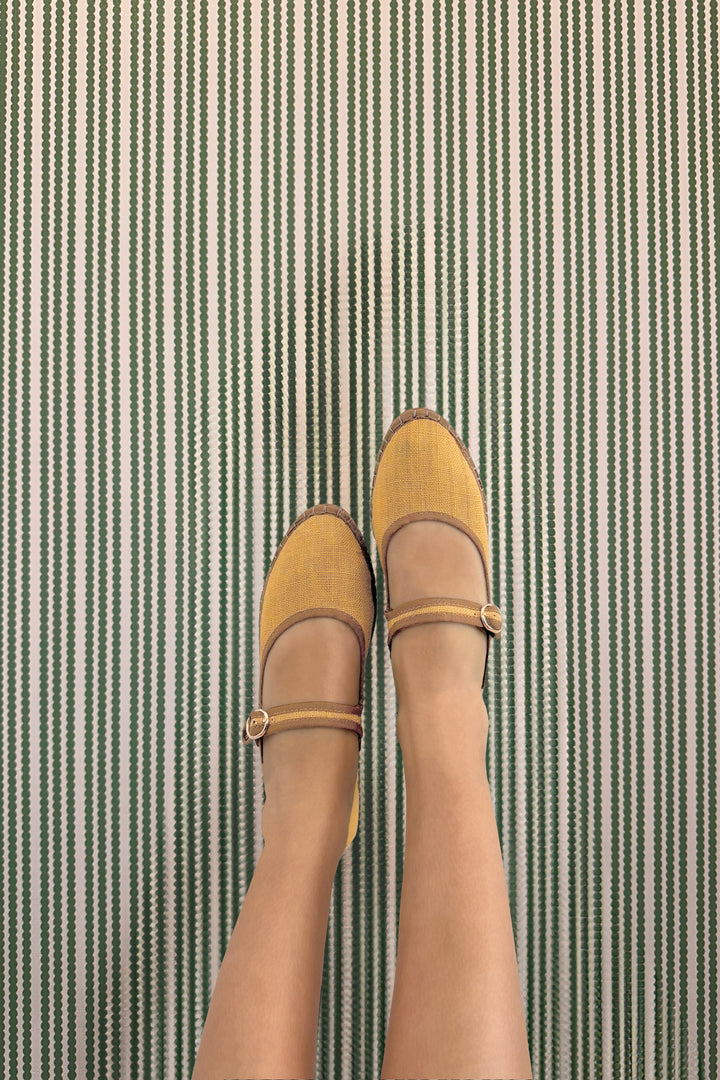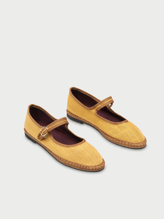 - Mercedita de lino envejecido en color mostaza con ribetes beige y cierre de hebilla.