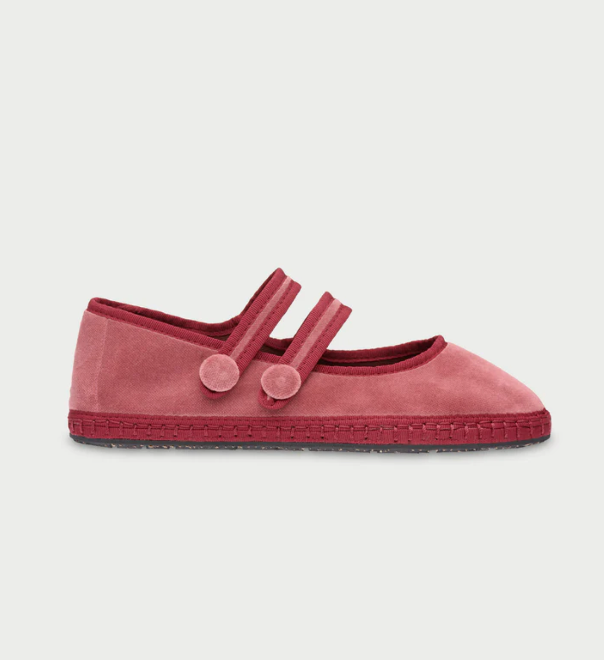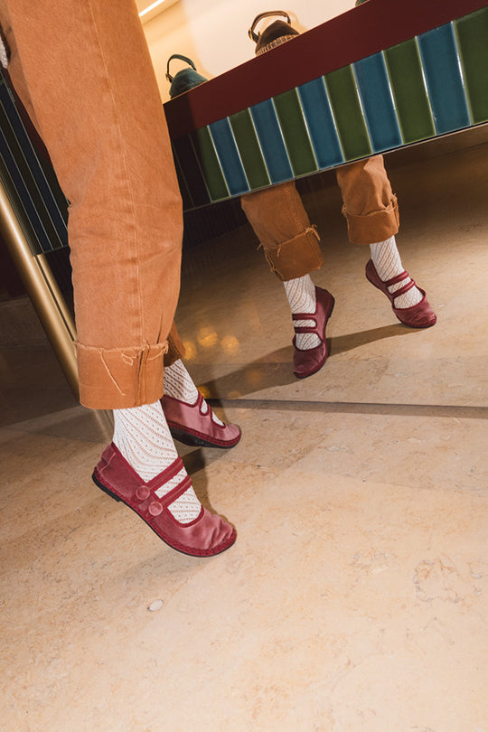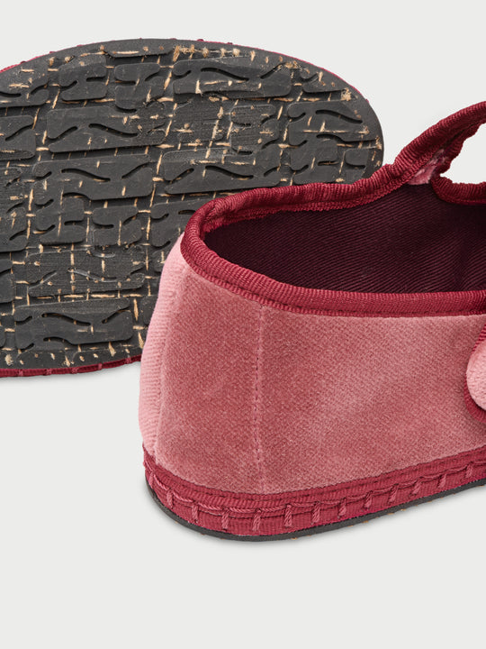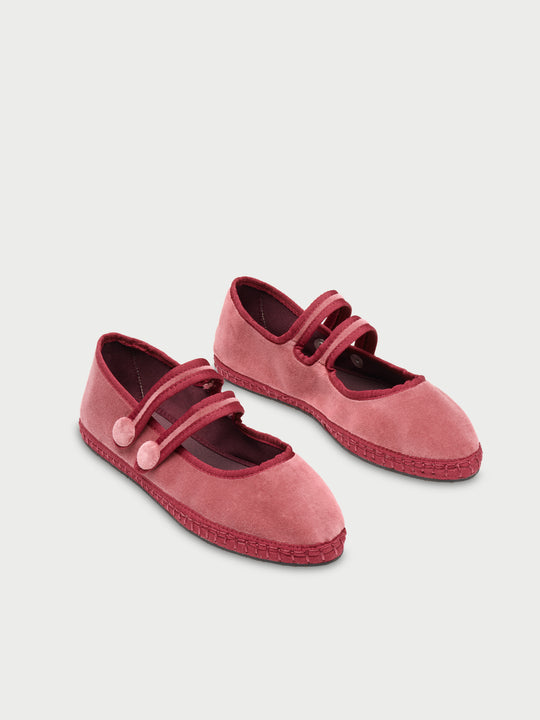 - Mercedita de terciopelo en color rojo claro con ribetes rojos y cierre con doble botón a presión.
