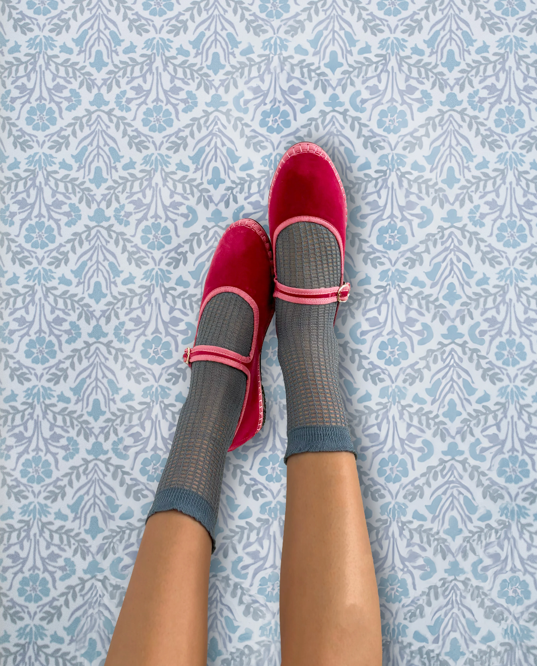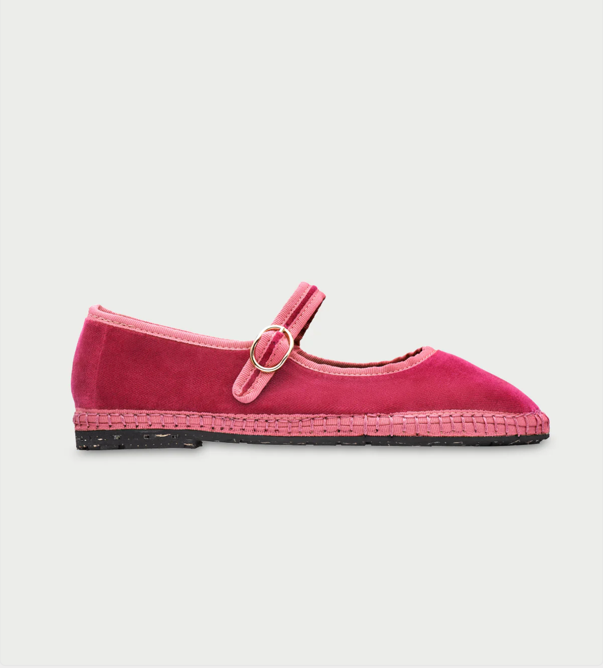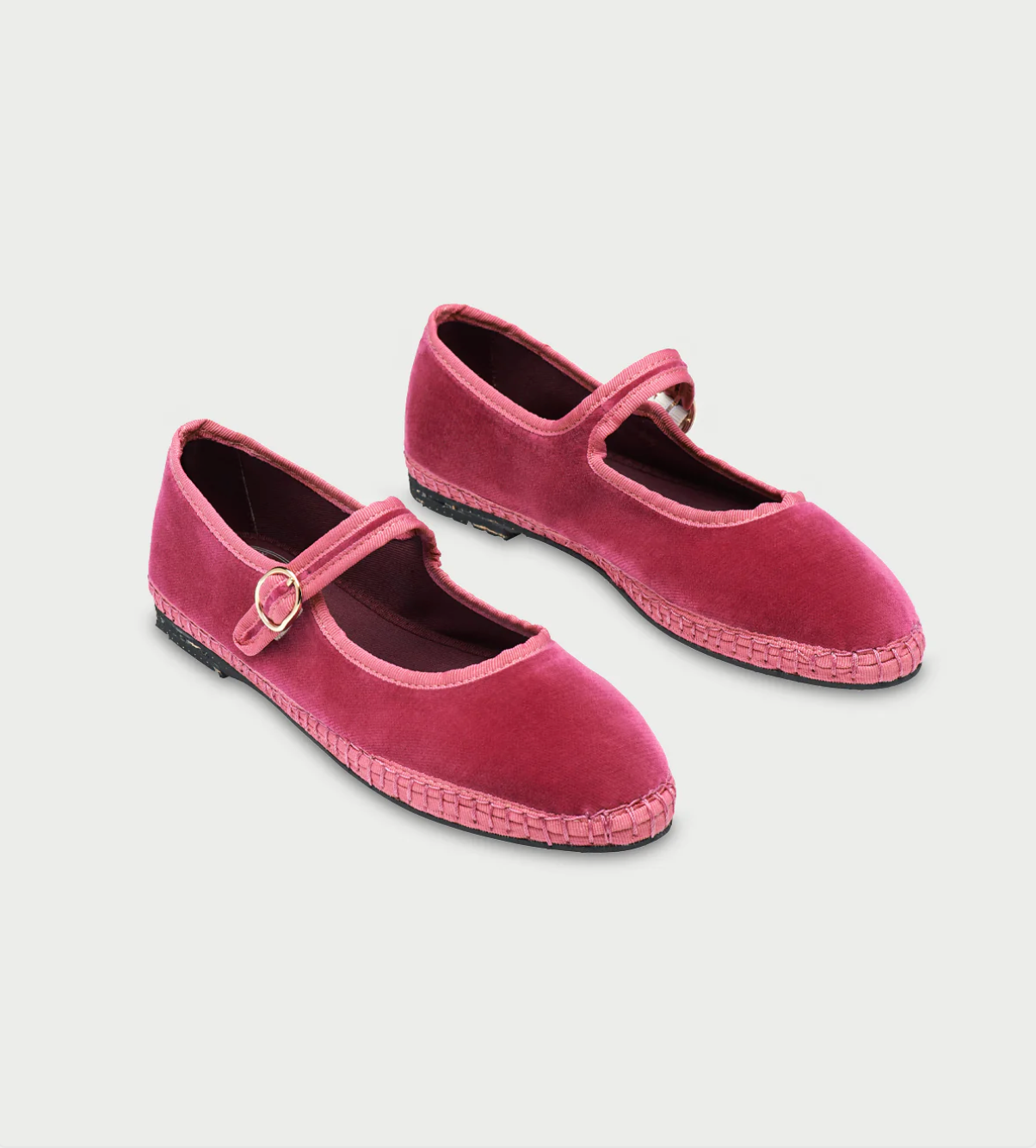 - Merceditas de terciopelo en color rosa con ribetes rosas y cierre de hebilla.