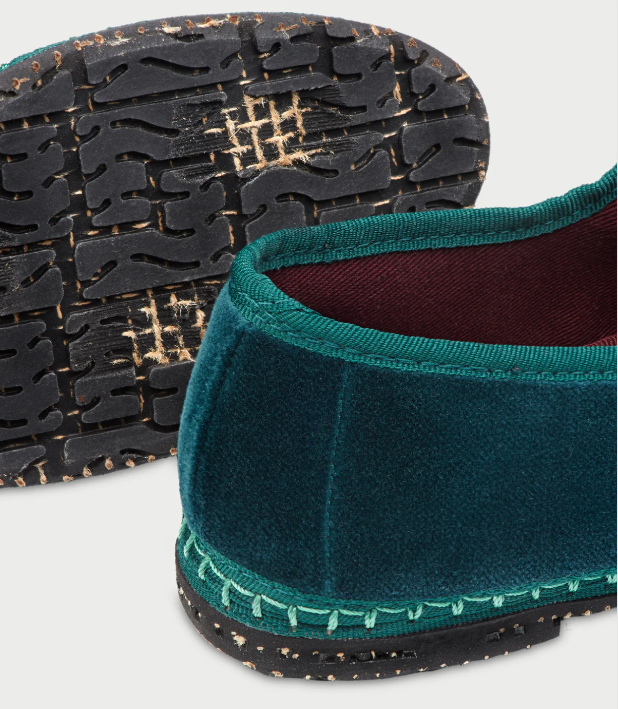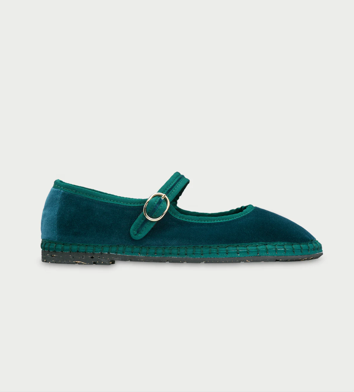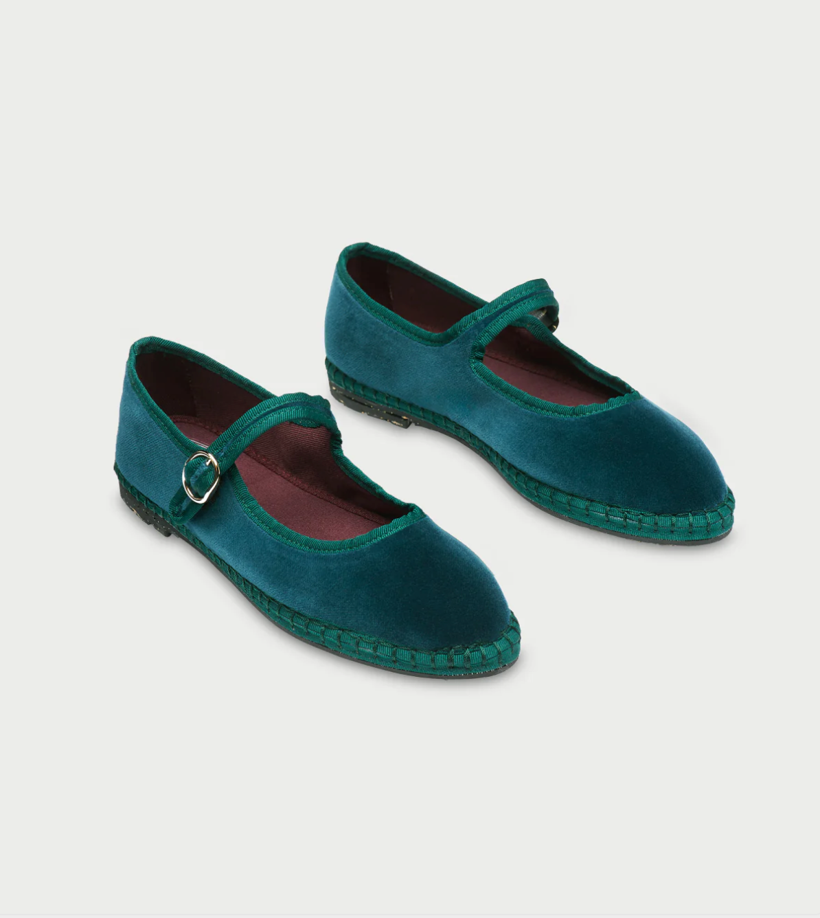 Mercedita de terciopelo en color verde oscuro con ribetes verde oscuro y cierre de hebilla.