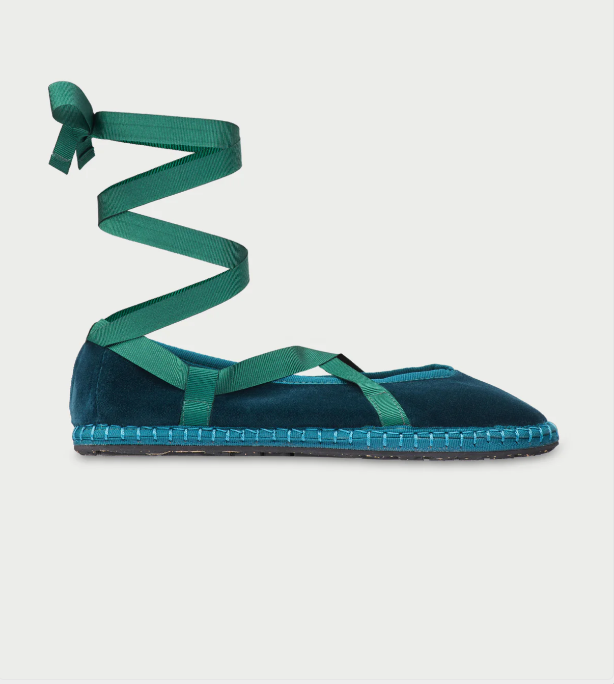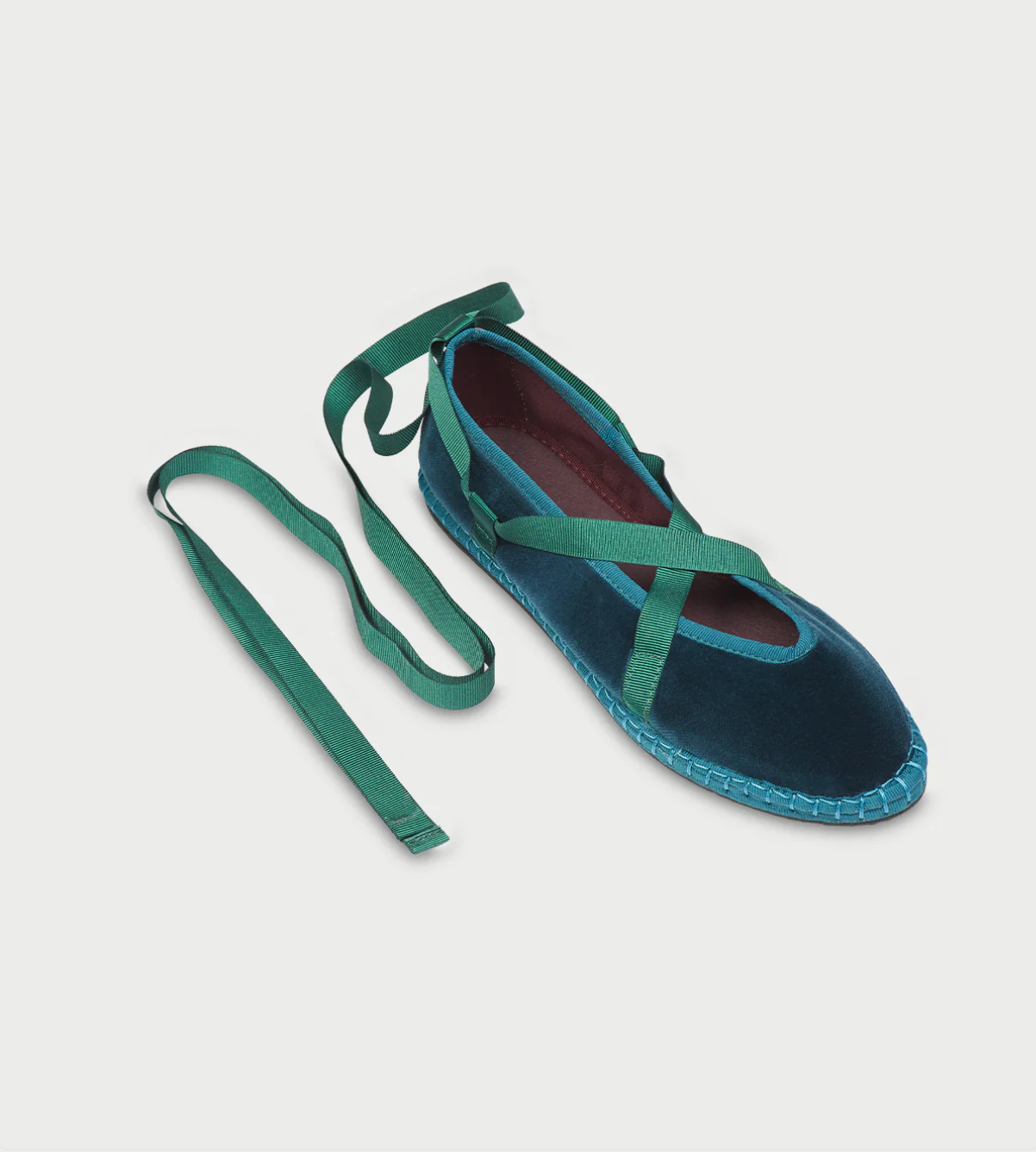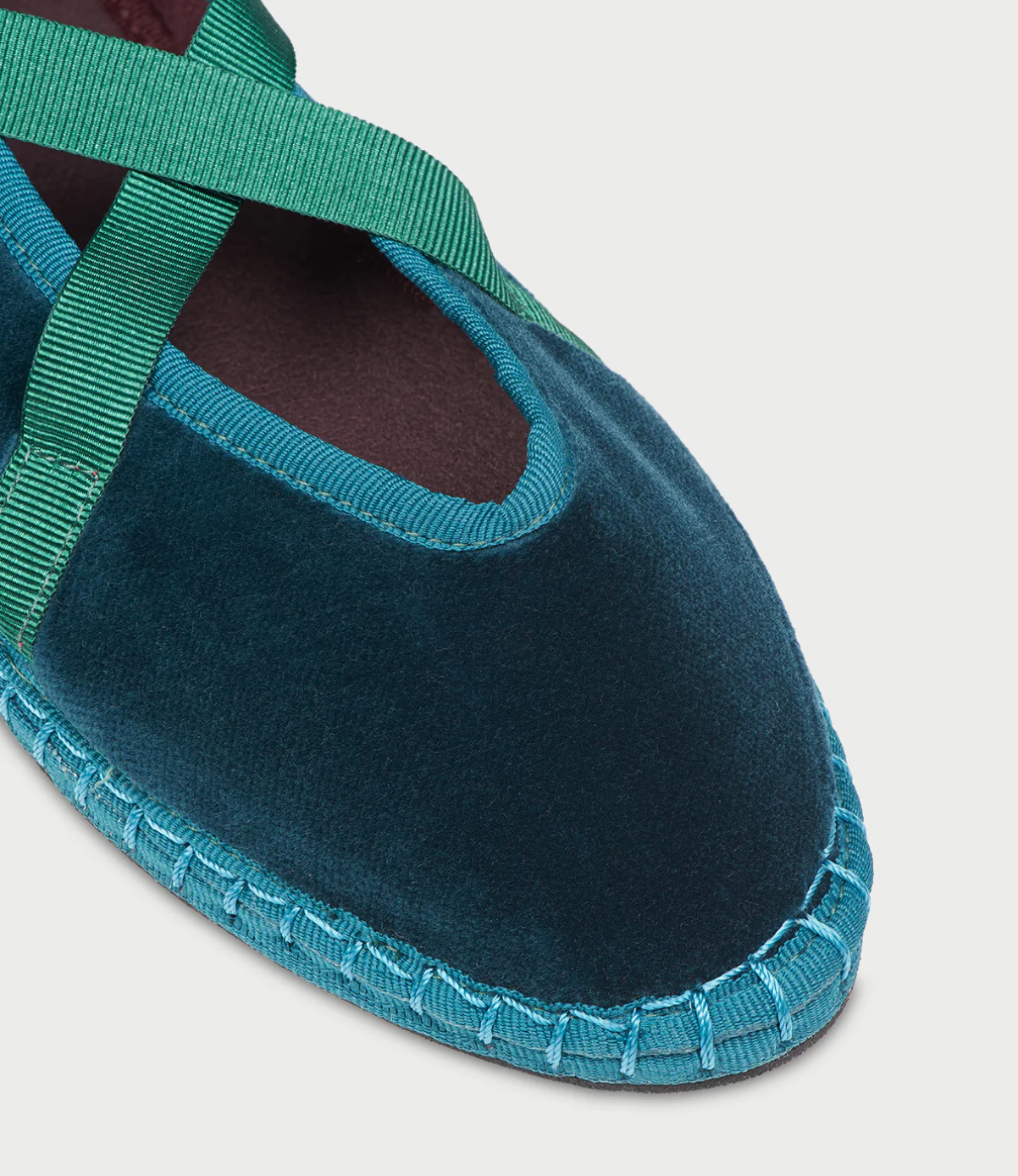 - Slipper de terciopelo en color azul con ribetes celestes y lazos verdes.