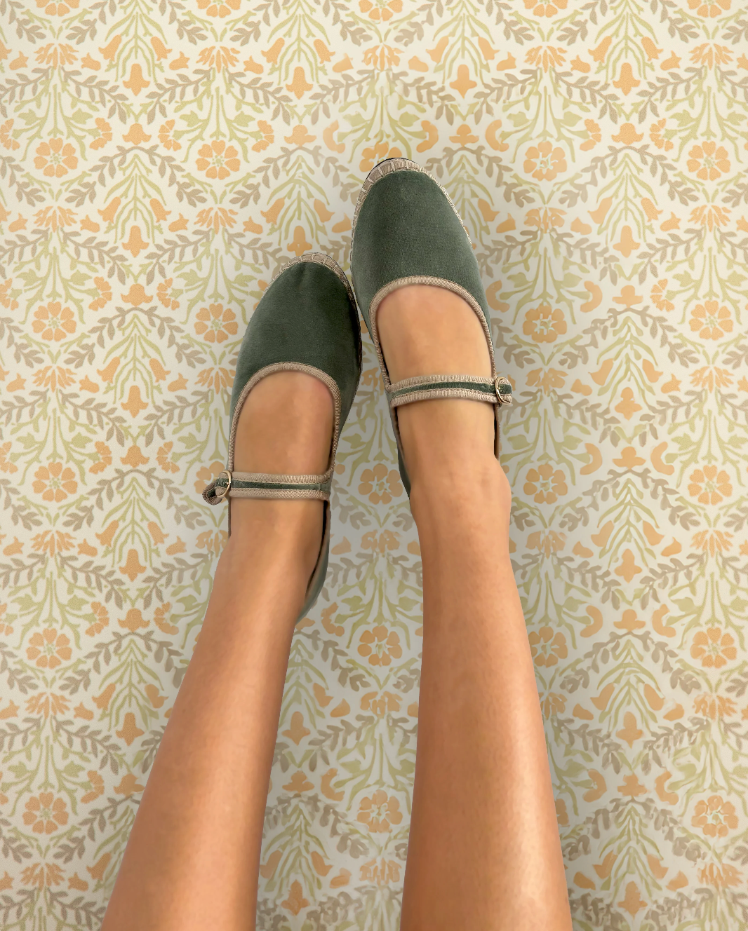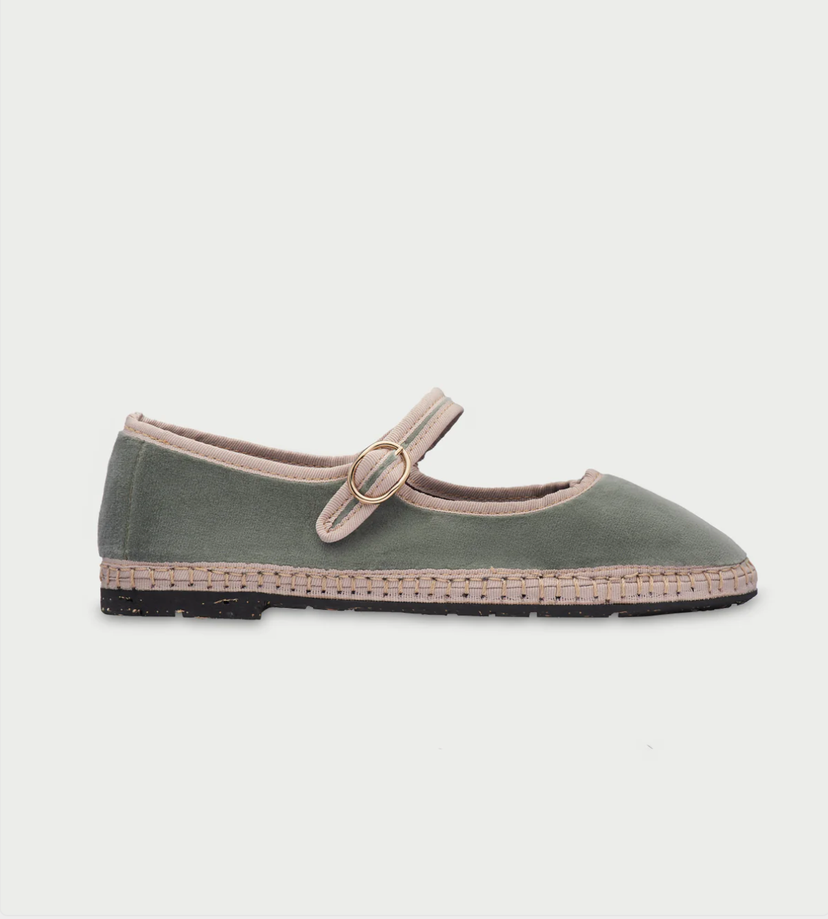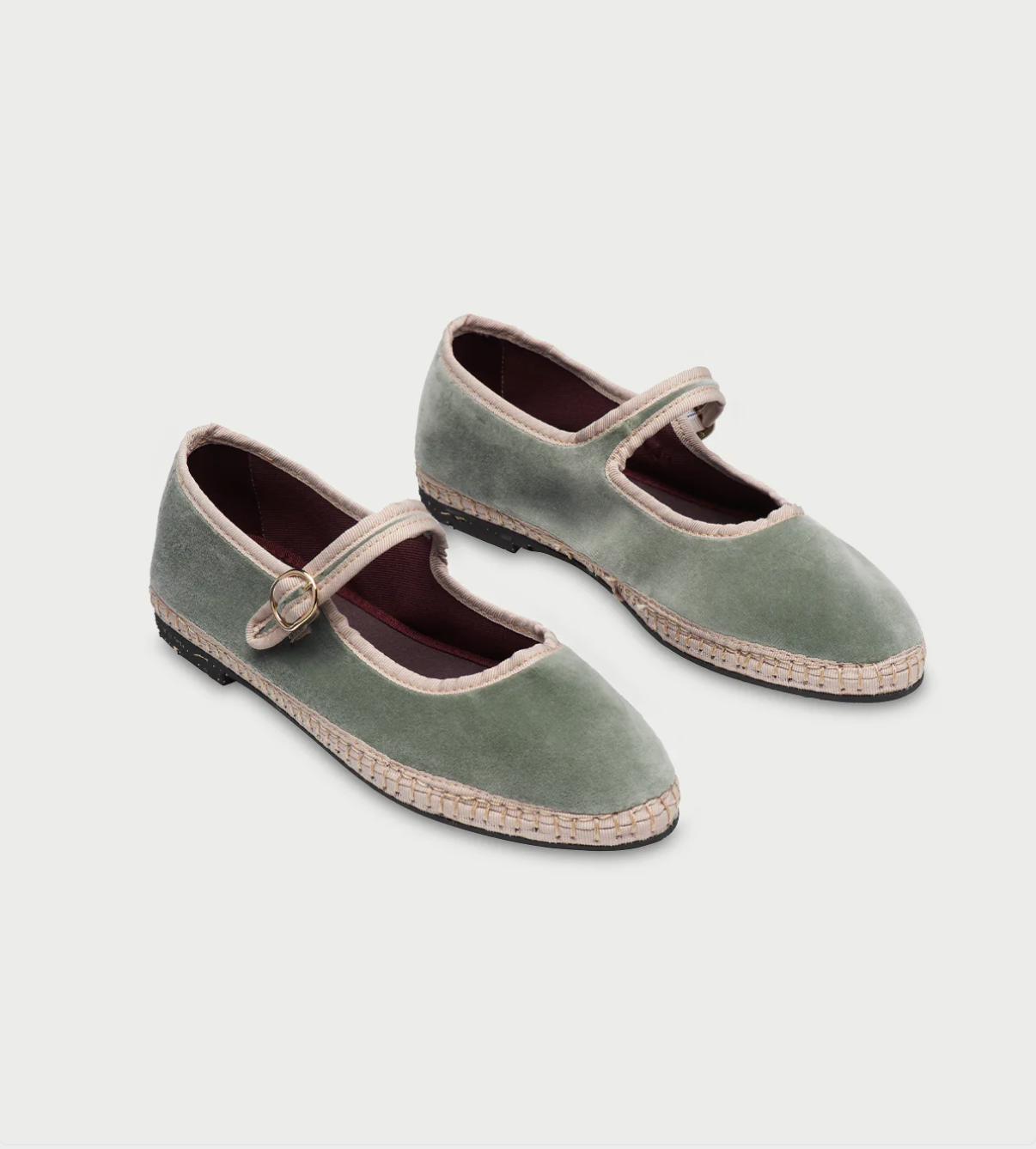 - Mercedita de terciopelo en color verde claro con ribetes en beige claro y cierre de hebilla.