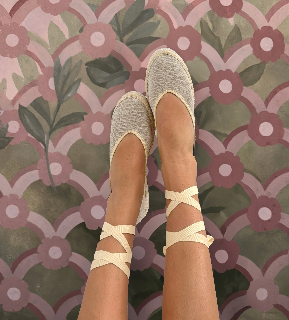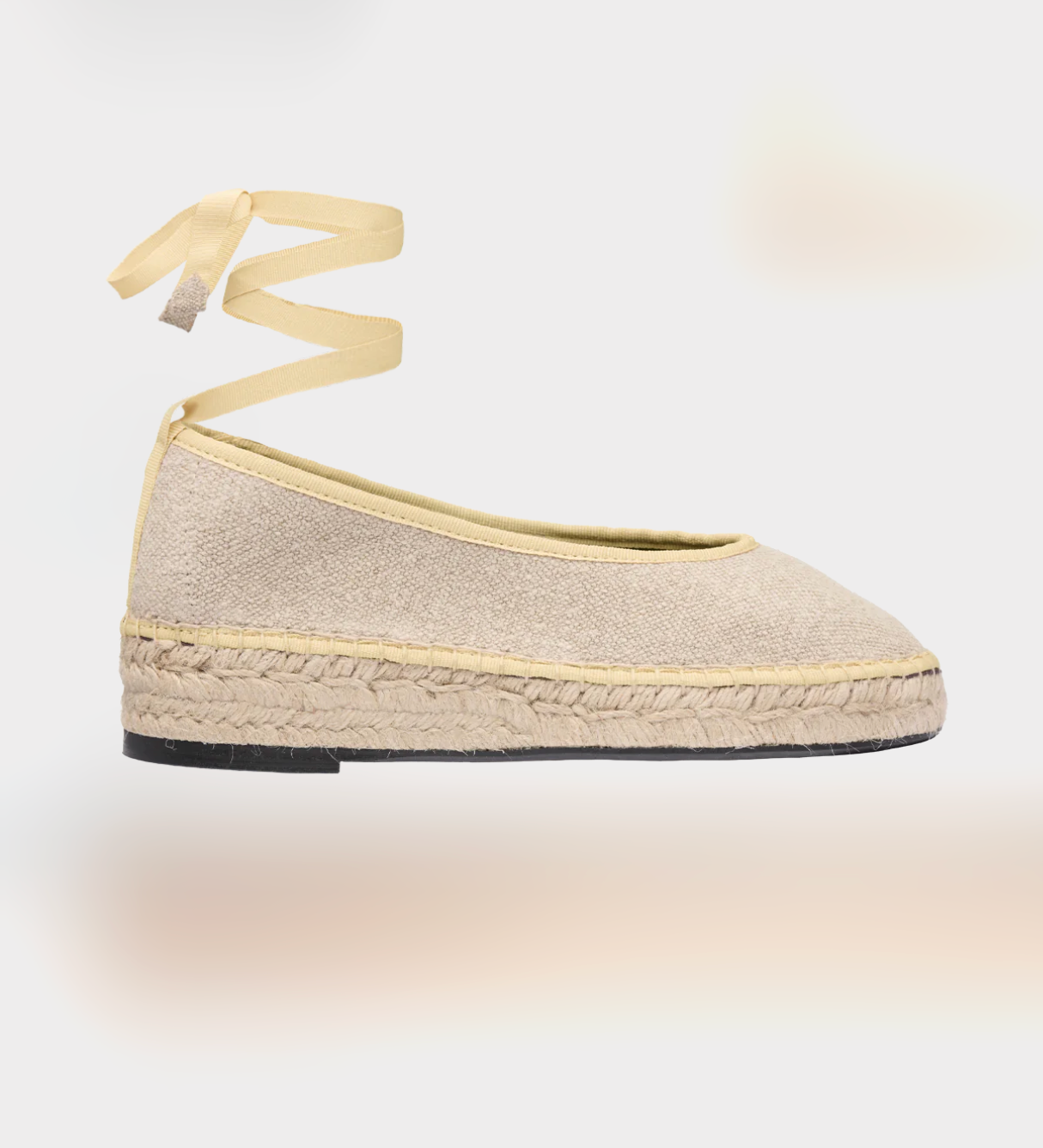 - Bailarina de lino beige con ribete y cordones en amarillo claro. Suela de yute natural.
