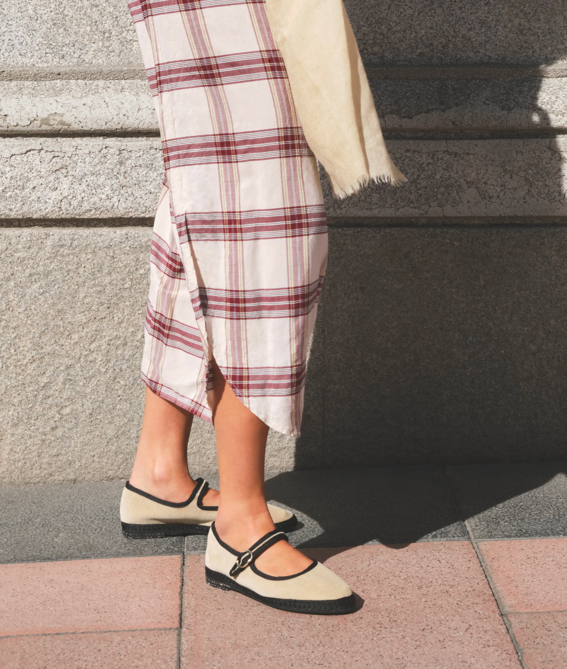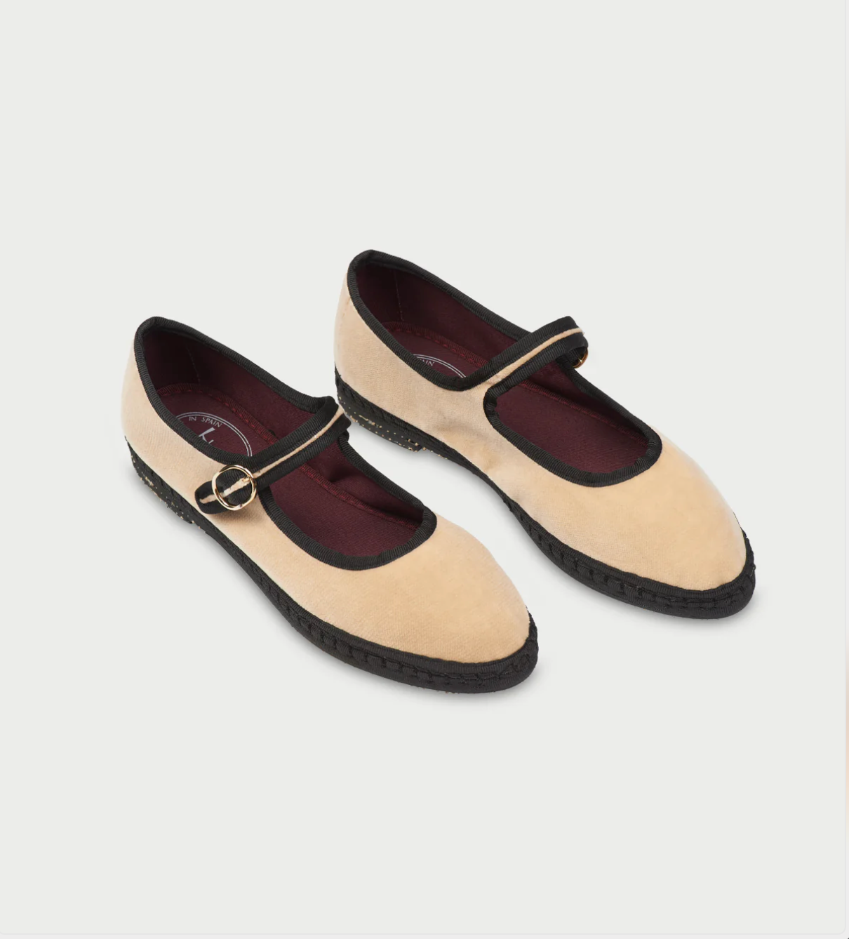 - Mercedita de terciopelo en color beige con ribetes negros y cierre de hebilla.