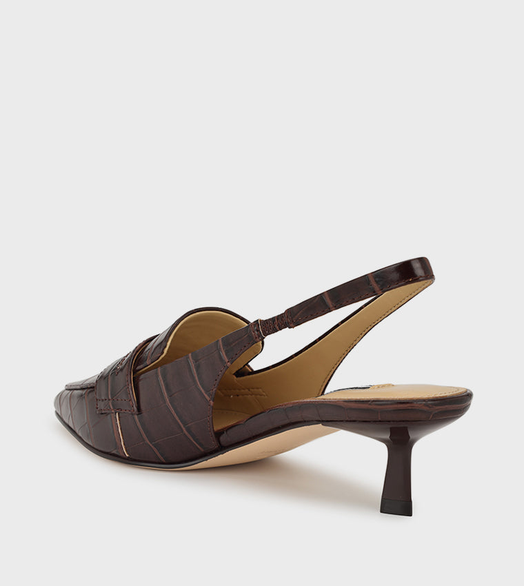 Redefine tus básicos de ocasión con el modelo Charlot3 de Nine West en un elegante tono Dark Brown. Con su silueta refinada de tipo slingback y punta puntiaguda, esta pump combina sofisticación y versatilidad, ideal tanto para días de oficina como para eventos formales.