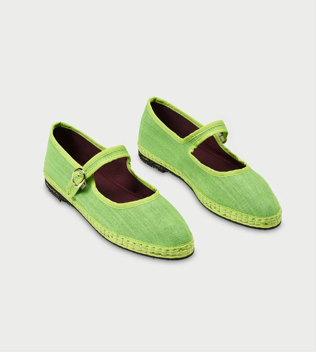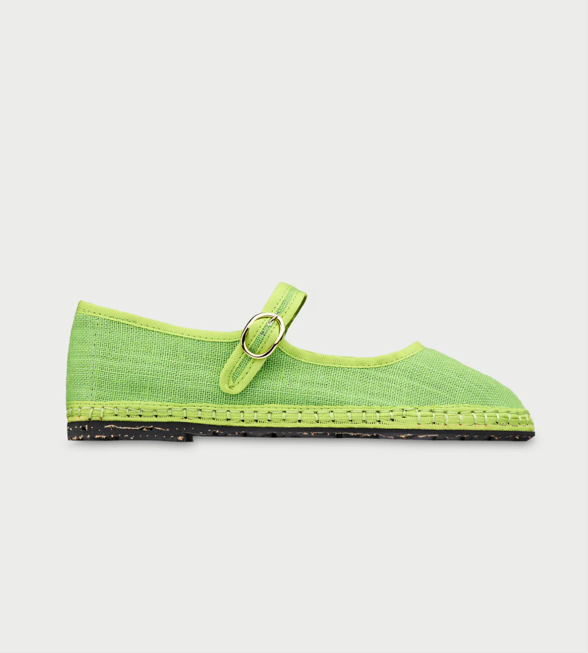 - Mercedita de lino en color verde claro con ribetes en verde claro y cierre de hebilla.