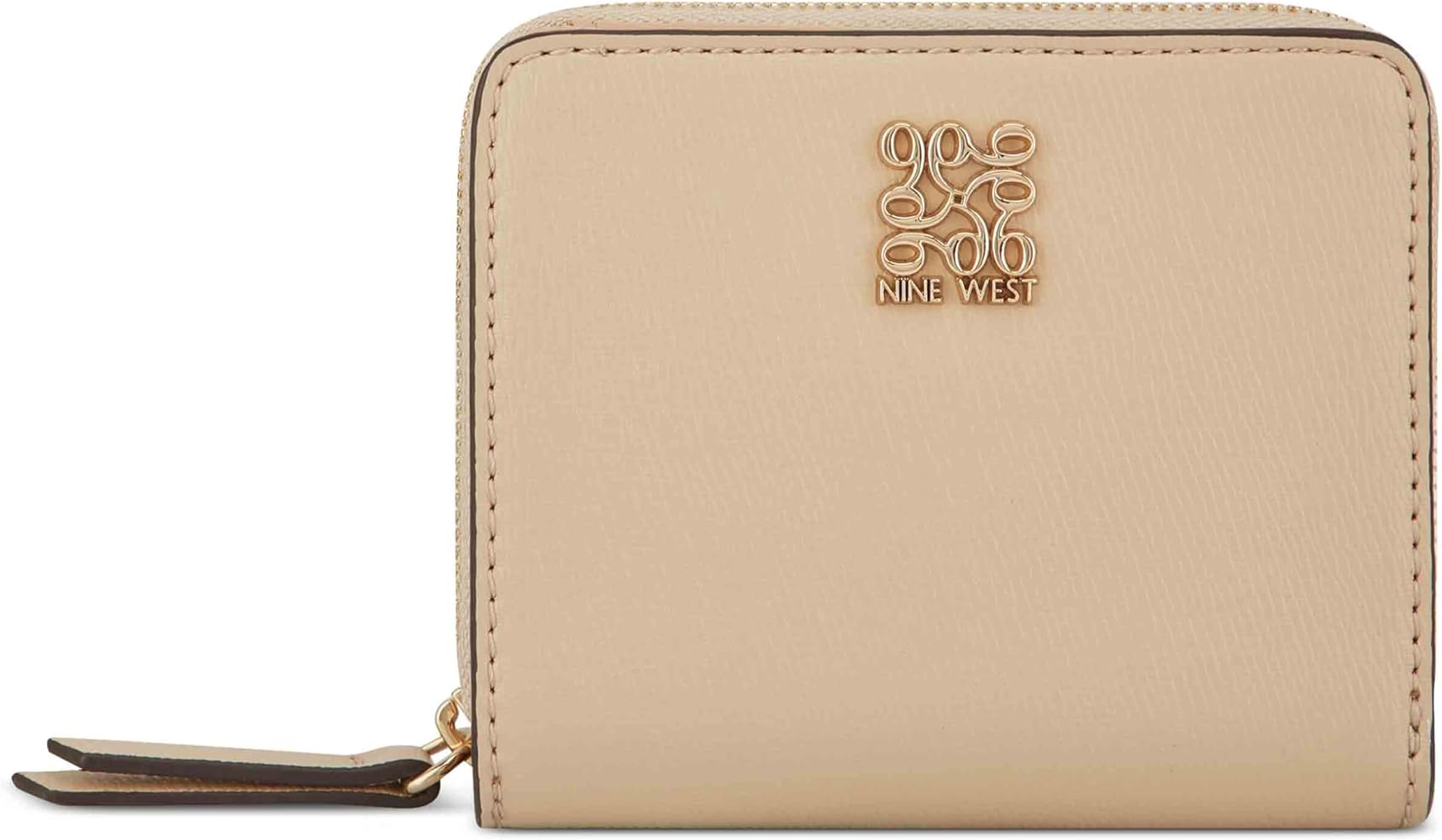Cartera pequeña Nine West Designer Grid 9 SLG con cremallera alrededor, marca de hardware, bolsillos internos para organización y cierre completo con cremallera.